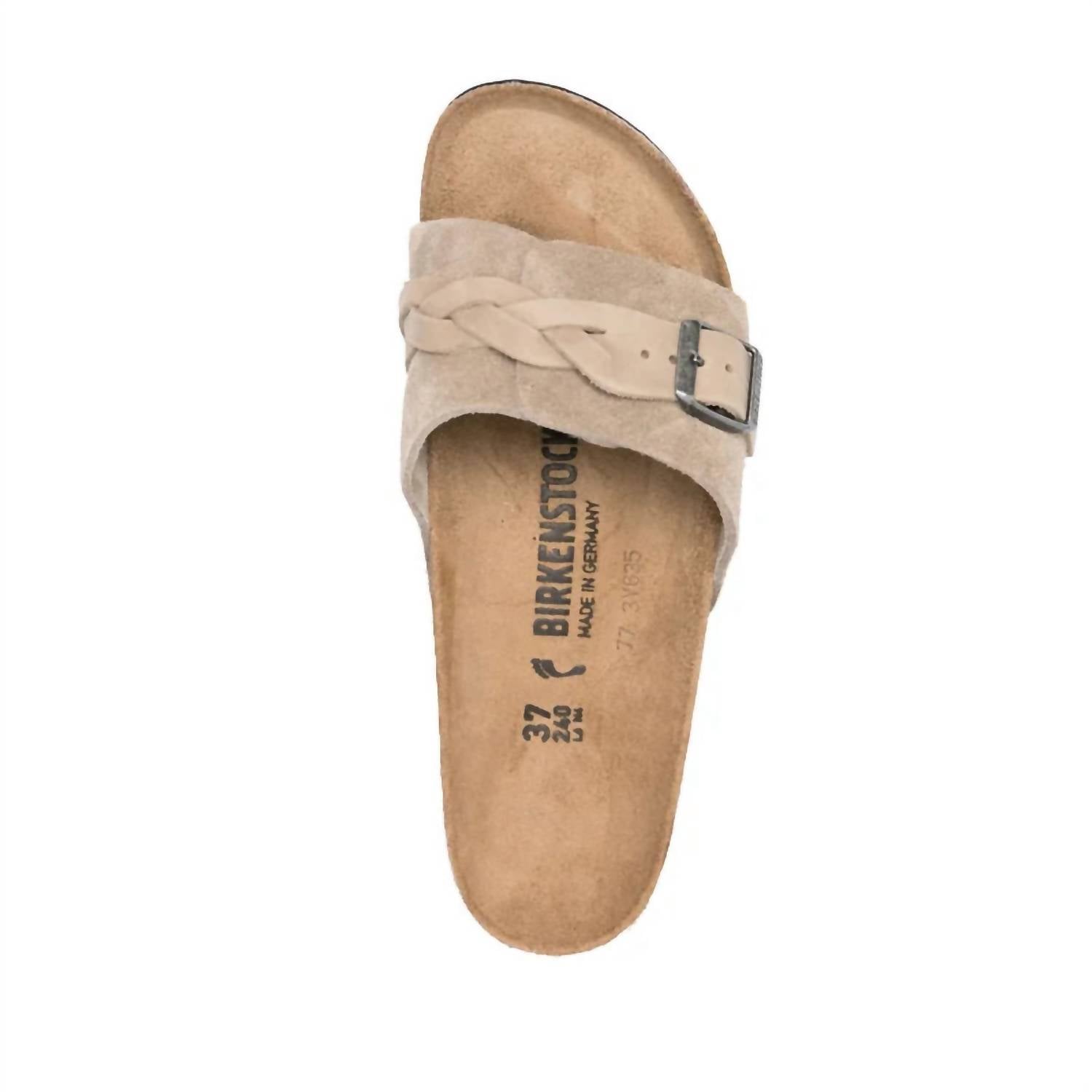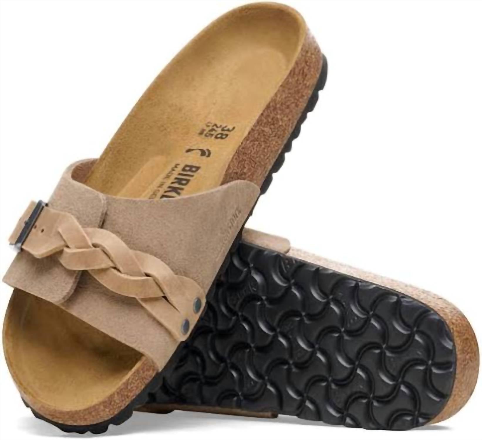 Eleve o nível dos seus calçados para o clima quente com a Sandália Feminina Oita Braided da BIRKENSTOCK em um elegante tom taupe. Confeccionada na Alemanha, ela ostenta um cabedal clássico em camurça com uma tira trançada de couro oleado e inspiração boho. O design aberto apresenta uma palmilha de cortiça e látex que oferece suporte personalizado e conforto durante o uso, complementada por um solado flexível de EVA. Desfrute do ajuste perfeito com sua tira de velcro e fecho ajustável com fivela de metal.