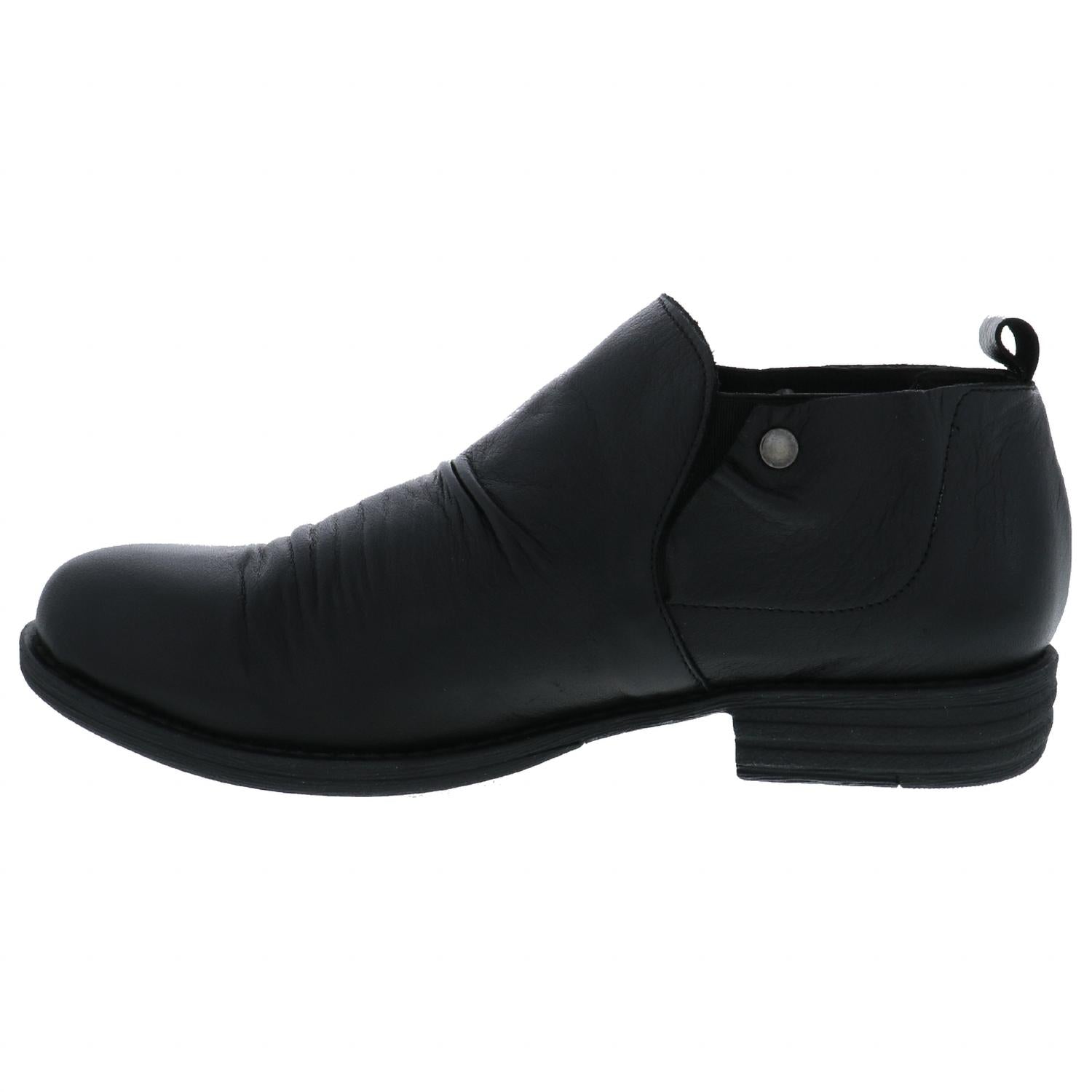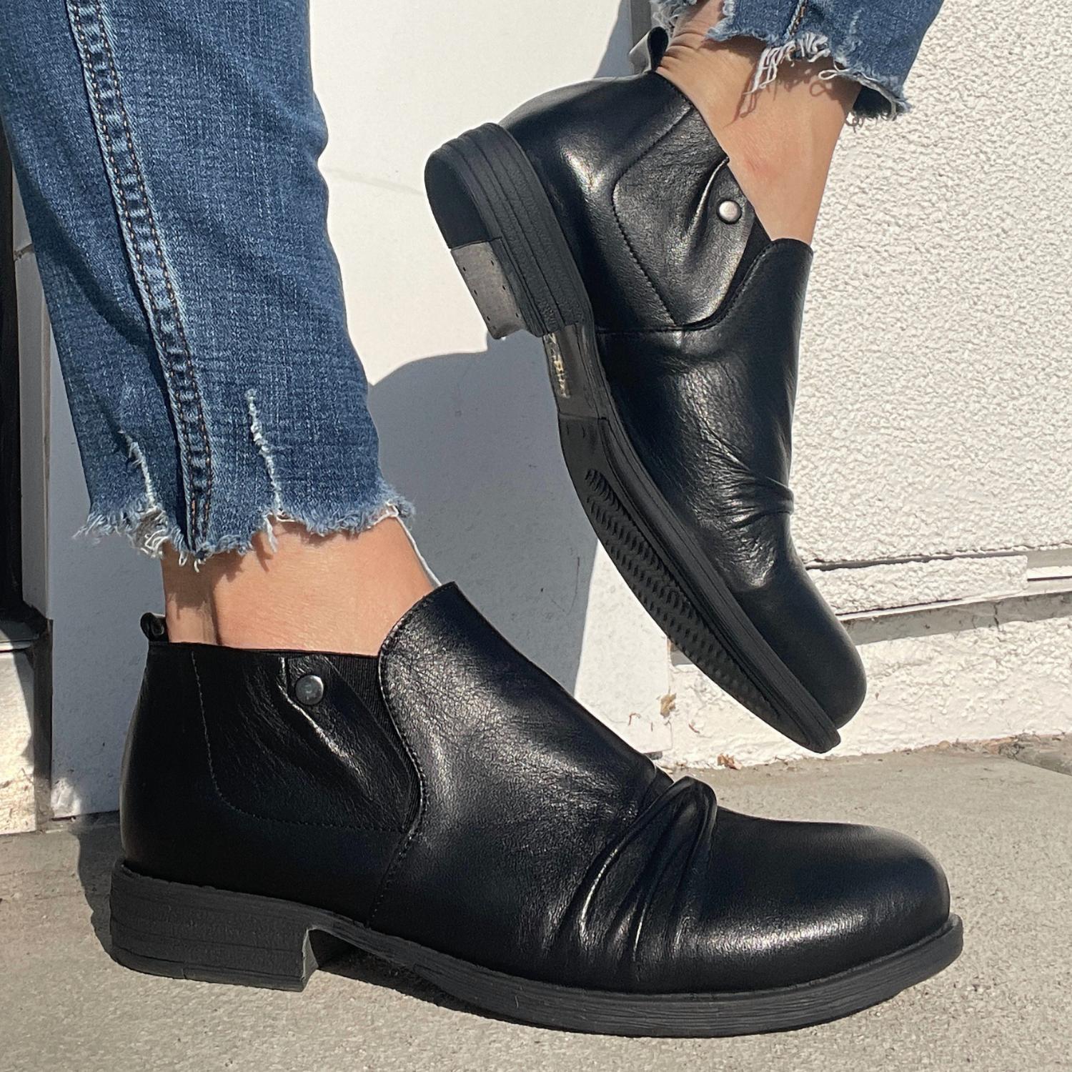 Step into style and comfort with the Ellis Leather Loafer by Biza, the perfect blend of a short boot and a chic loafer. Ideal for fall, this women's footwear in black leather features elastic gore side panels for easy wearability and an almond toe shape. Crafted with premium soft glove leather uppers, a leather-lined cushioned insole, and a lightweight and durable rubber outsole, it offers all-day comfort with a 1-inch heel. Designed in a medium width and fits true to size, it's the go-to shoe for workwear versatility.