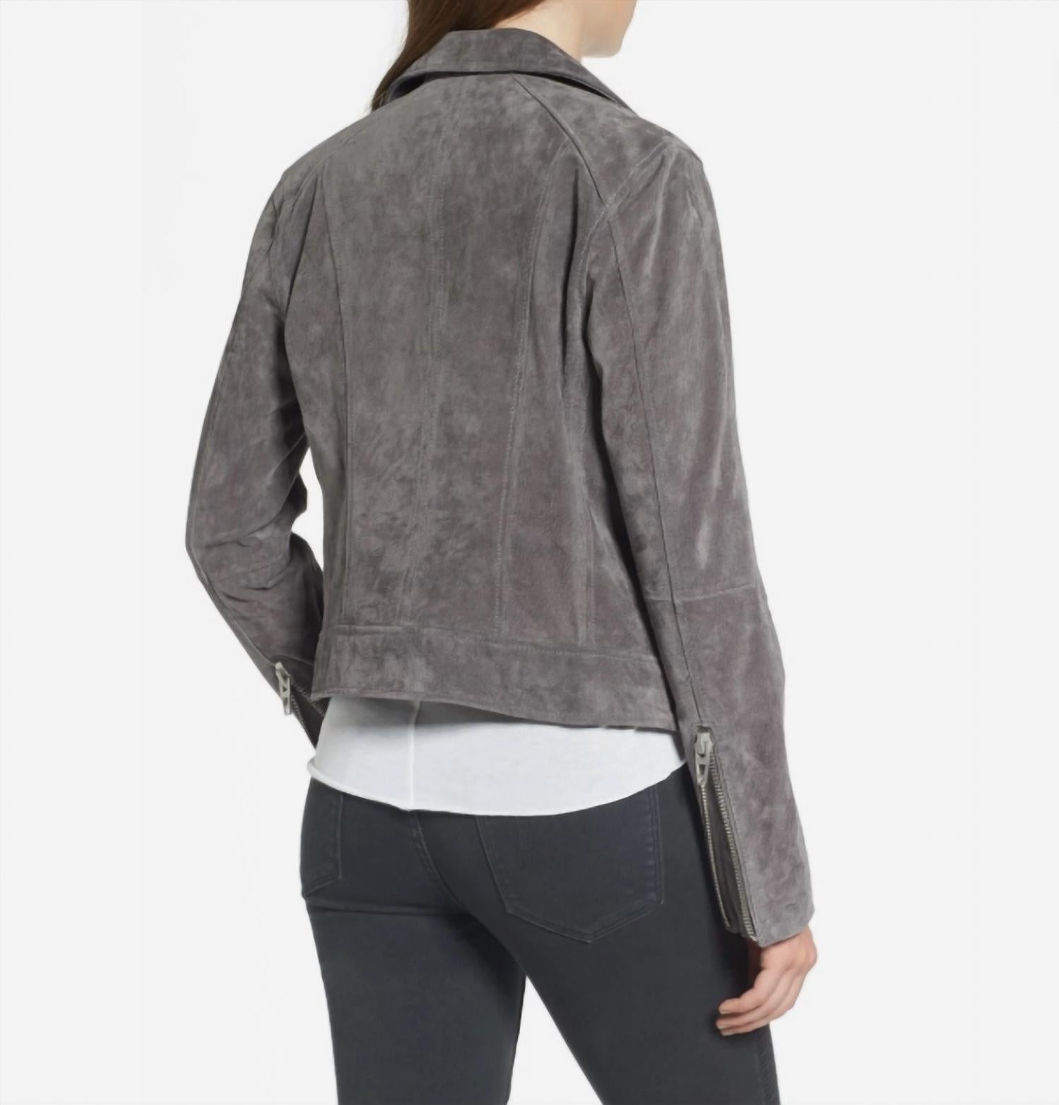 A leather jacket so good, it works with just about any outfit. Incredibly smooth and always in style, this luscious suede jacket is a wardrobe must-have with its cool moto-inspired silhouette and gleaming hardware. Asymmetrical front-zip closure Notched collar Long sleeves with zip cuffs Front zip pockets Lined Suede Leather