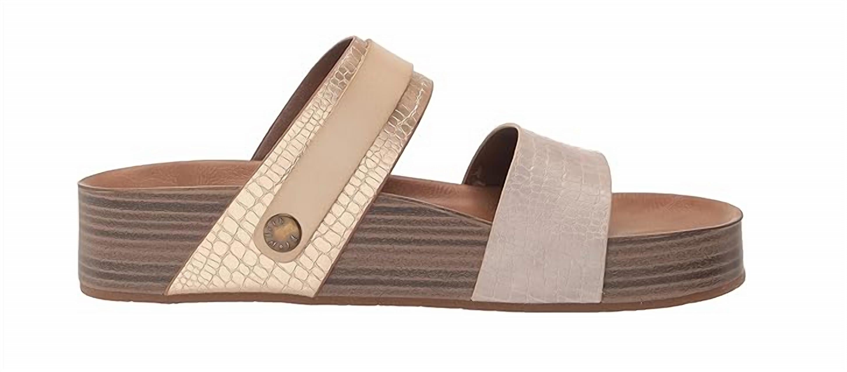 Esta sandália plataforma possui tiras ajustáveis, palmilha moldada flexível e design slip-on. Inclui fecho com botão da marca e fivela de metal, confeccionada em cabedal sintético vegano.
