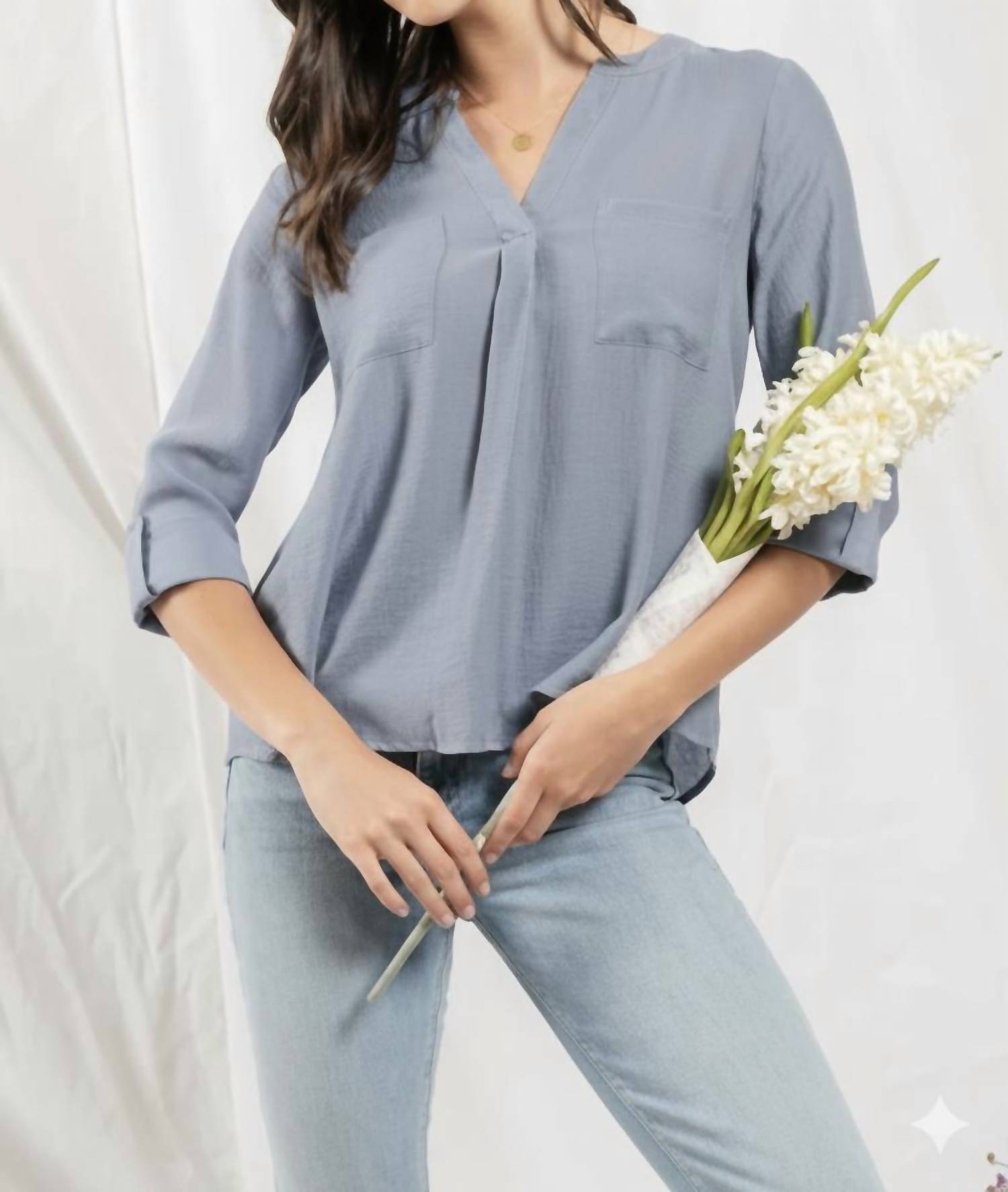 Pair this with your favorite jeans and slides for your next girls night out. Elevate your wardrobe with the Split Neck Back Button Three Quarter Tab Sleeve Top by Blu Pepper, exuding understated elegance in light teal. This minimalist yet stylish blouse, crafted from 87% rayon and 13% nylon, promises comfort and durability with its solid pattern and soft texture. Designed in a feminine three-quarter sleeve style, it features a chic split V-neckline and elegant back nonfunctional buttons, perfect for a holiday party or casual day out. Pair this versatile piece with your favorite bottoms for seamless spring style, making it a must-have addition for any Thanksgiving or seasonal gathering.