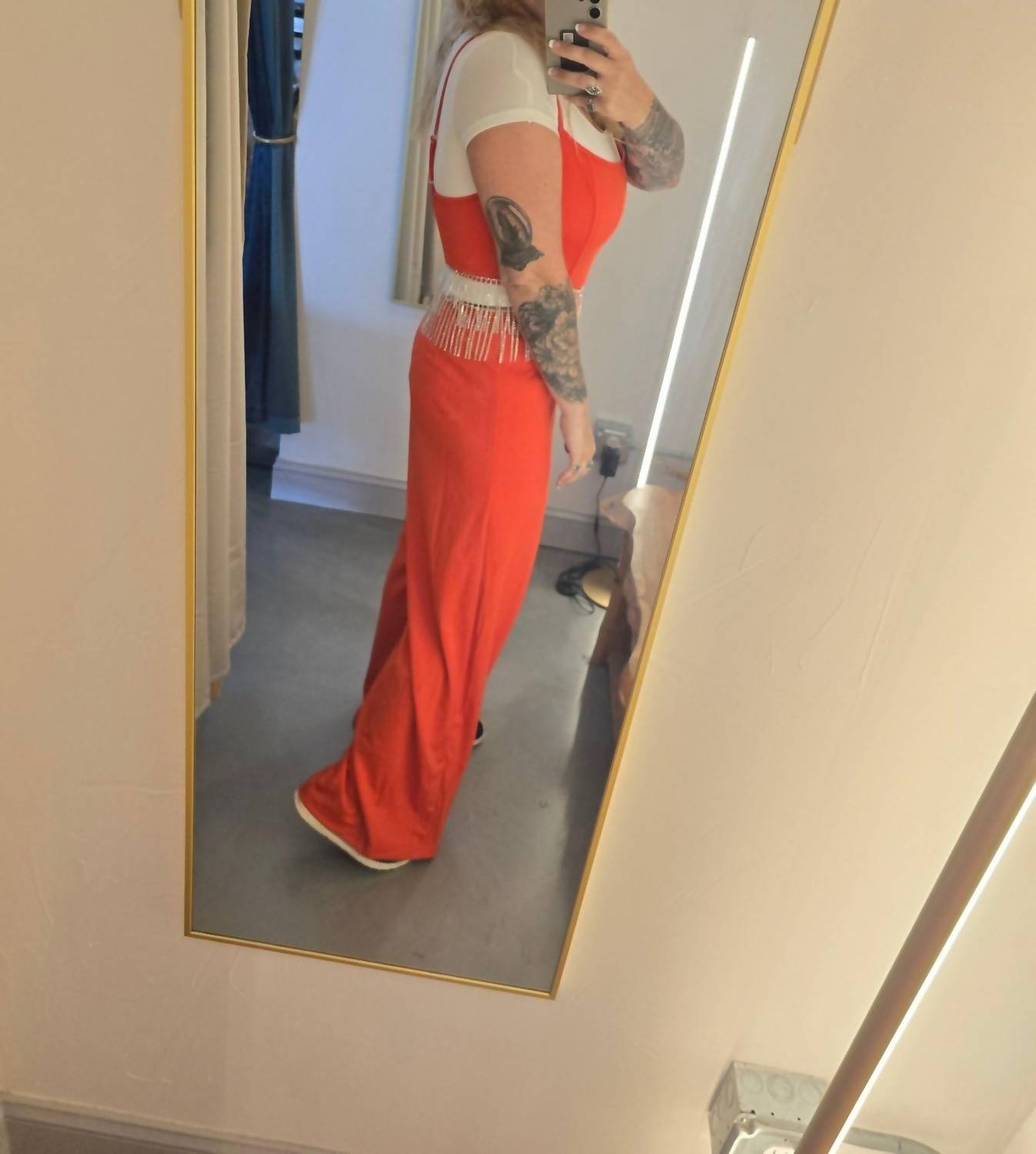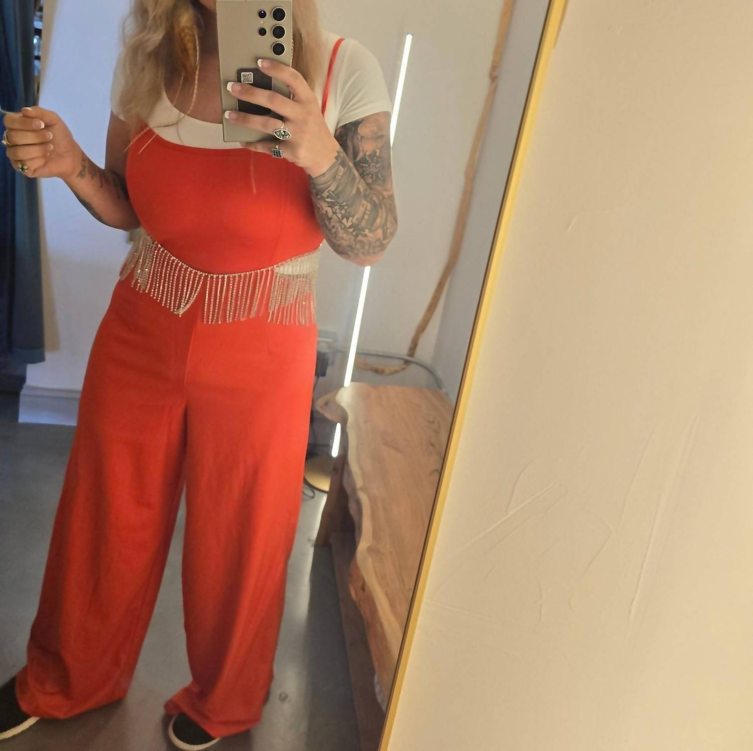 The perfect outfit choice when you you need something quick to throw on and still want to look efforlessly cool. Turn heads and steal the spotlight in the Rhinestone Fringe Cut Out Side Open Back Jumpsuit by Blue B. Ideal for making a statement, this stunning red piece features a flattering bustier bodice and sparkly rhinestone fringe that captures every light. It's crafted from polyester, with a relaxed fit wide leg design that's perfect for boot-scootin' fun, complete with a zip closure. The high rise waist and open back detail add to its allure, while care is simple with hand wash and line dry instructions.