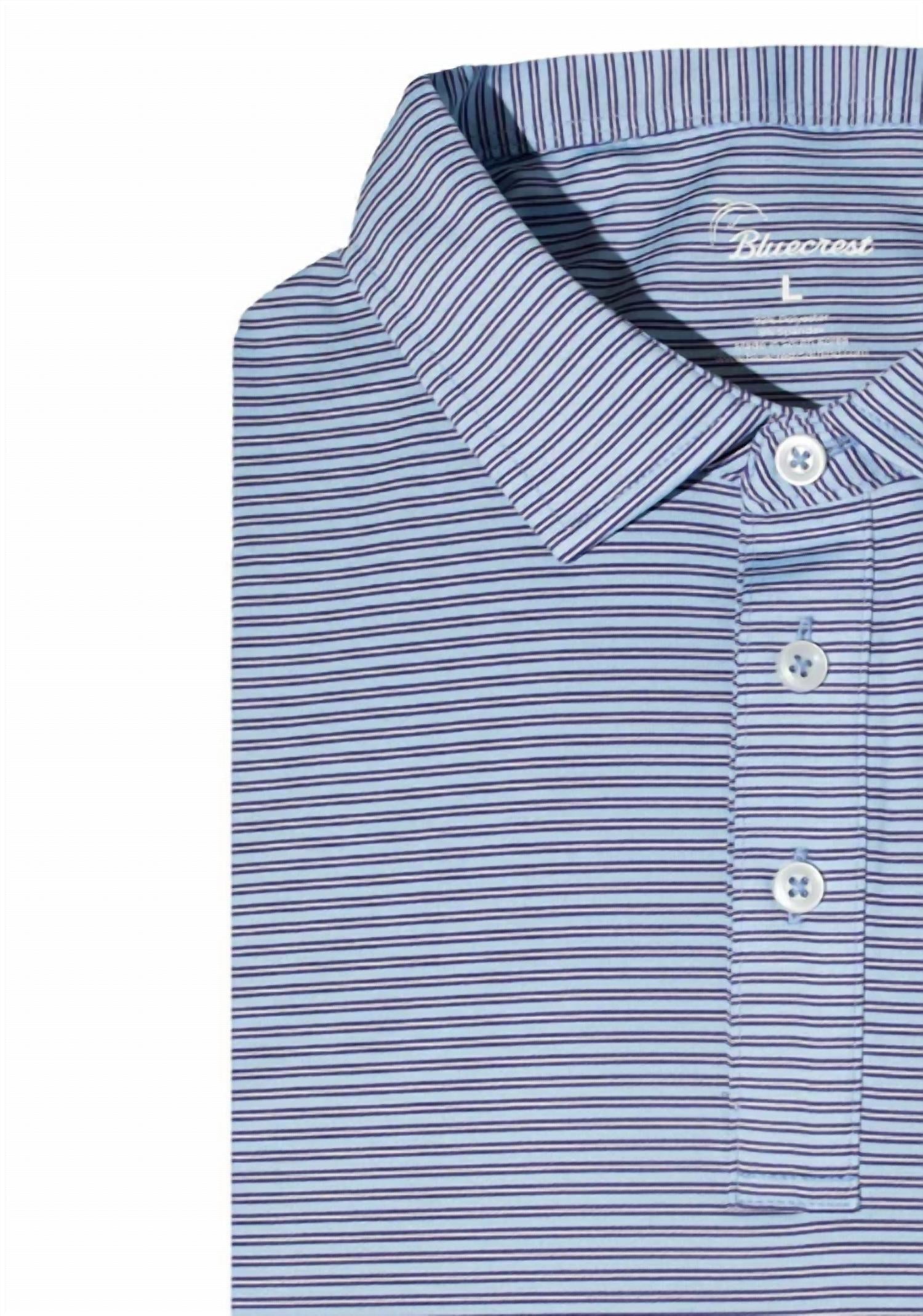 Elevate your style with the Men's Graduate Stripe Performance Polo by Bluecrest, featuring short sleeves for a classic look. Crafted with premium 4-way stretch, moisture-wicking fabrics, this polo ensures maximum comfort and durability for any occasion. The design includes a self collar, 3-button placket, and embroidered Bluecrest logos, offering sun protection in its stripe pattern of blue, navy, and white. Closure: Button closure. Care: Low maintenance, machine wash.