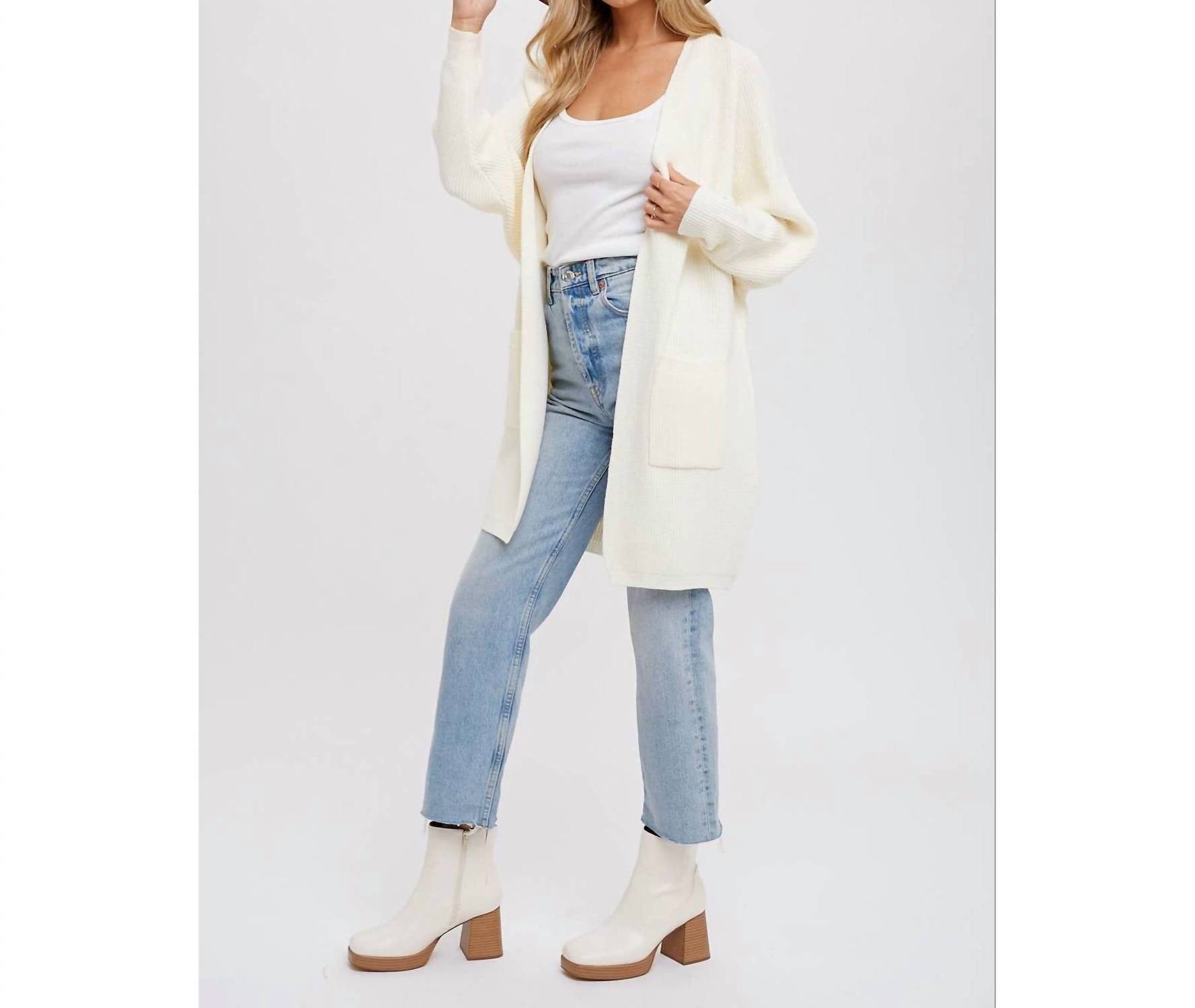 A classic fit that works just as good buttoned as it does left open. This open-front cardigan effortlessly combines fashion and practicality. Featuring relaxed batwing sleeves for a flowy, comfortable fit and handy side pockets for small essentials, it’s perfect for layering and adds a modern, stylish touch to any outfit.