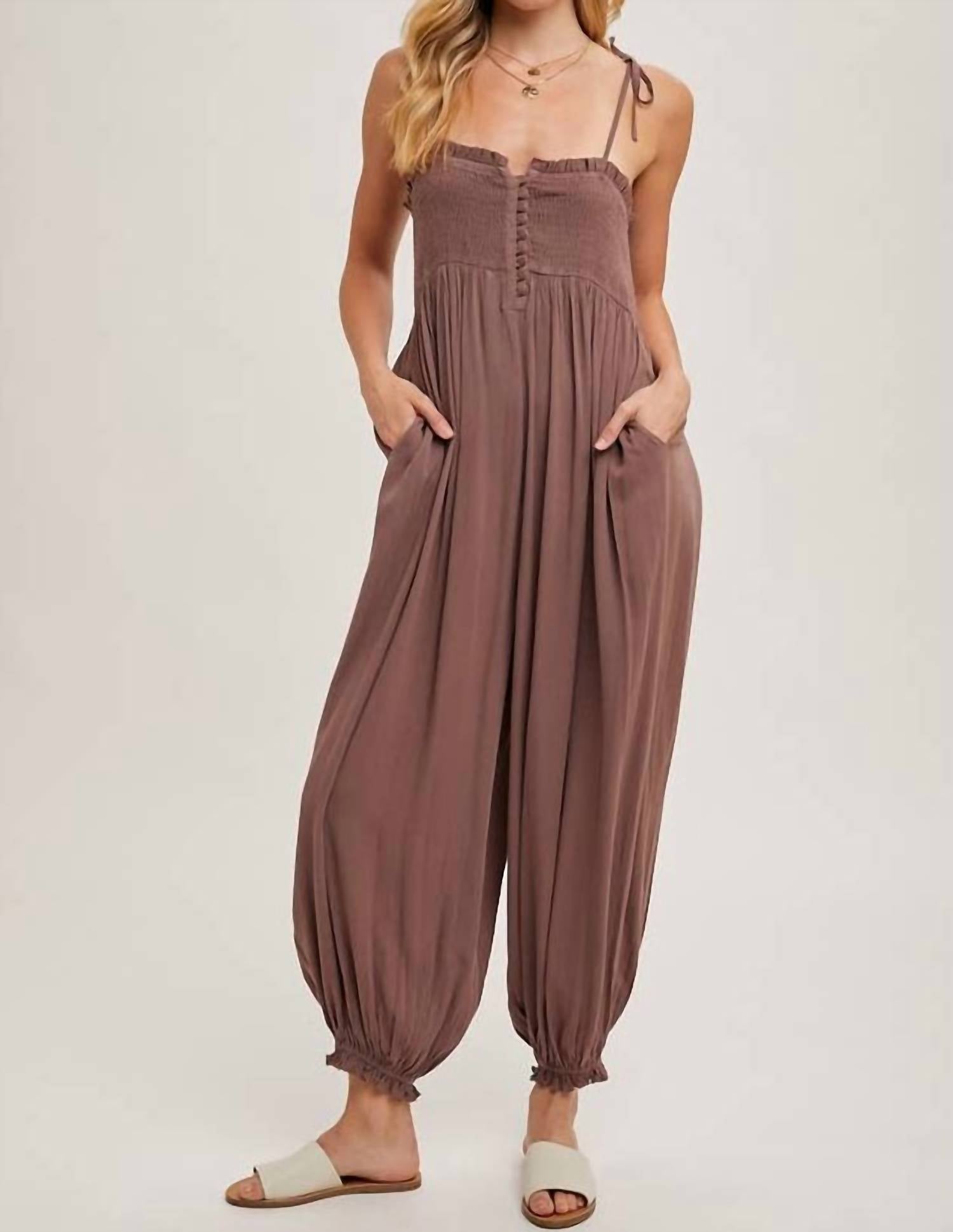 Elevate your summer style with the Isadora Smocked Button Front Jumpsuit by BluIvy, a Boho Chic essential for holiday parties. This beautiful brown jumpsuit features adjustable tie straps and a button closure for a flexible fit, complete with a smocked top for added flair. It showcases a cuffed hem and a relaxed fit with a tapered leg style, including functional pockets for added practicality. Care is simple with machine wash and tumble dry instructions, making this solid design a versatile addition to your wardrobe.