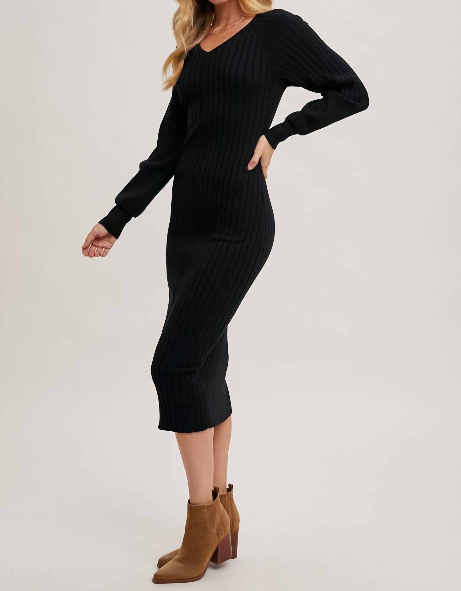 Bluivy - Women's V Neck Ribbed Knit Sweater Midi Dress