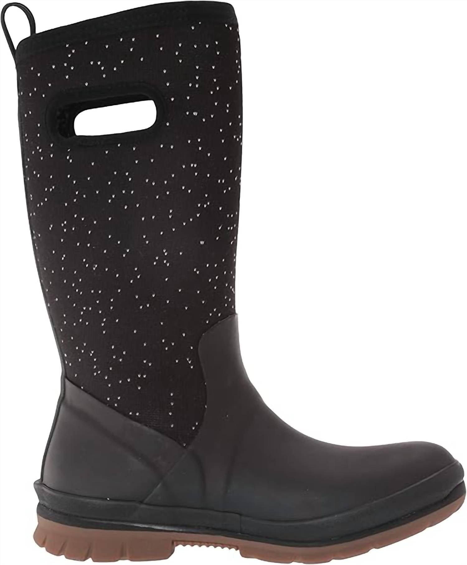 The Bogs Women's Crandall Tall Insulated Boots, also known as Bogs Crandall Tall Speckle or II Tall, are 100% waterproof with 3mm Neo-Tech insulation, designed for cold and wet conditions. They feature Rebound cushioning for comfort and energy return, a steel shank in the outsole for stability, and a low pile faux fur lining for warmth. The boots incorporate DuraFresh bio-technology to control odors and BOGS Max-Wick technology to wick moisture away, keeping feet dry. The slip-resistant GlacialGrip outsole provides maximum traction on icy surfaces. They have an eco-friendly, algae-based EVA footbed made from BLOOM material that supports environmental sustainability. The boots are rated for temperatures as low as -40°F/-40°C.