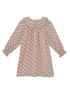 Crafted entirely from 100% cotton, this pink dress flaunts a geometric print that adds a touch of whimsy. Featuring a charming Peter Pan collar with a ruffled edge and long raglan sleeves with elasticized cuffs, it ensures ease of wear with its convenient button closure at the back.