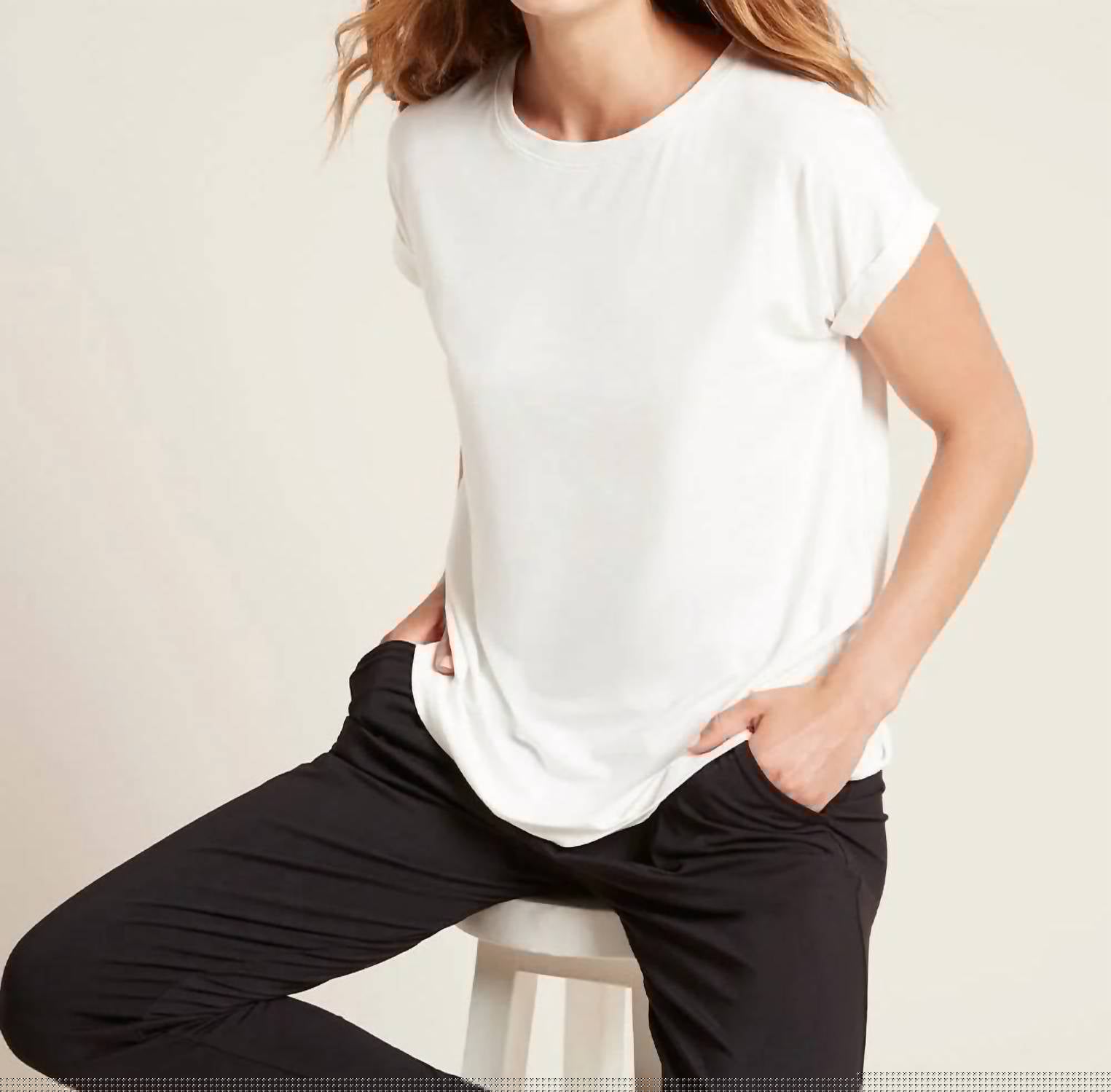 The short sleeve tee you'll want in every color. Experience the Downtime Lounge Top by Boody, a minimalist essential in Natural White for your loungewear collection. Crafted with short sleeves and a breathable 95% Viscose, 5% Elastane, this top offers comfort with its lightweight construction. Its pull-on closure and high-to-low curved hem add a relaxed charm, perfect for summer gatherings. Care instructions recommend machine washing warm, with tumble dry low or line dry in shade for easy maintenance.