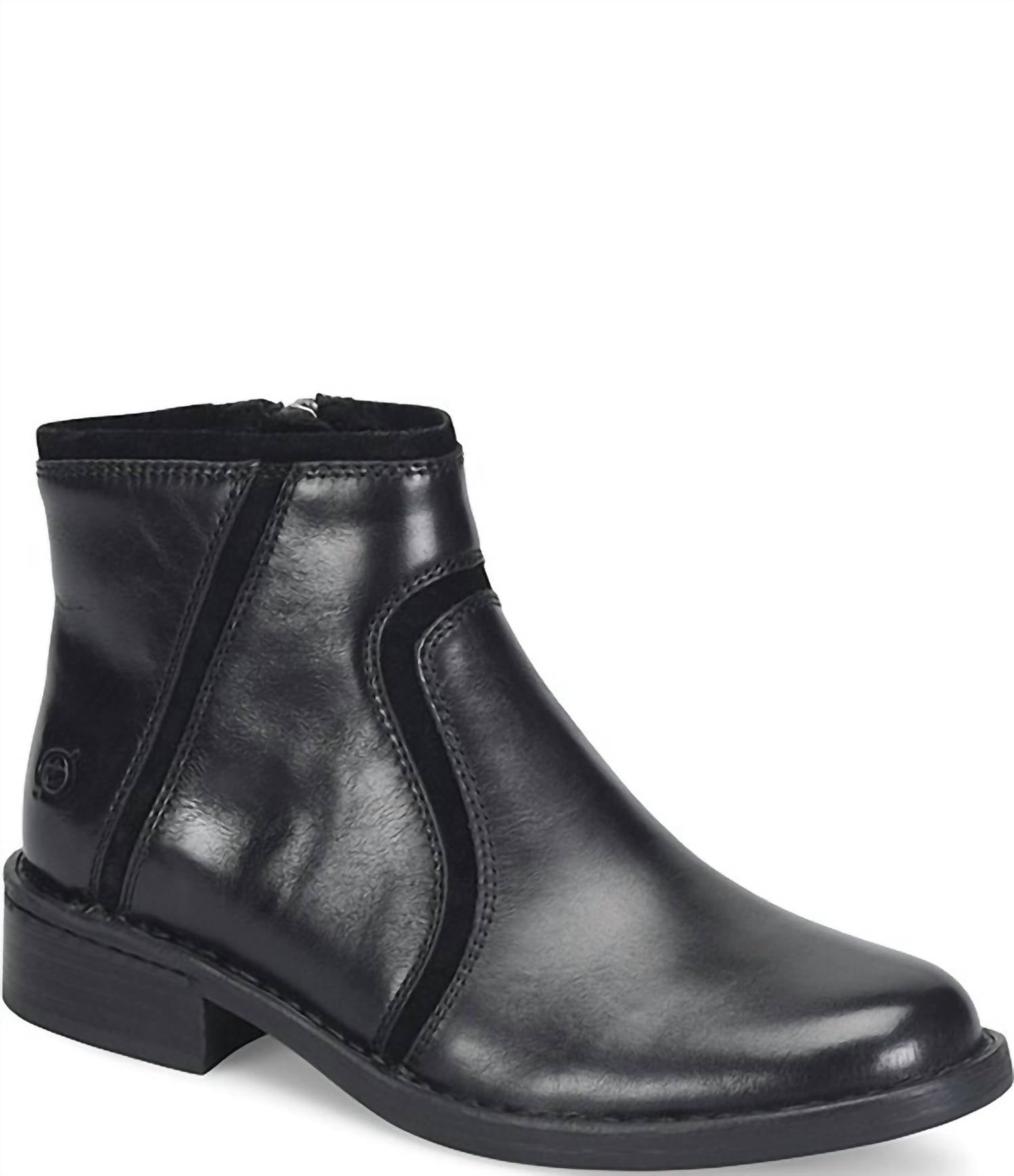 Say hello to the perfect, most versatile boot. The ankle height makes this style easily transition from day to night. Wear them with your favorite skinny jeans and tee for a more laid back look, or pair them with your favorite mini dress and jacket for a night out on the town. Experience timeless elegance and comfort with the Women's Cincy Leather Booties by Born, crafted for women who value both style and practicality. These booties feature a 4" shaft and a 1" stacked heel, providing a harmonious blend of form and function, with an almond toe shape for added sophistication. Made from a full grain leather and suede combo, they feature a micro suede lining for softness and a rubber, micro suede-covered PU foam footbed for cushioning. Enhanced with suede accents, these booties boast a side zipper for easy wear, making them a standout in any workwear ensemble.