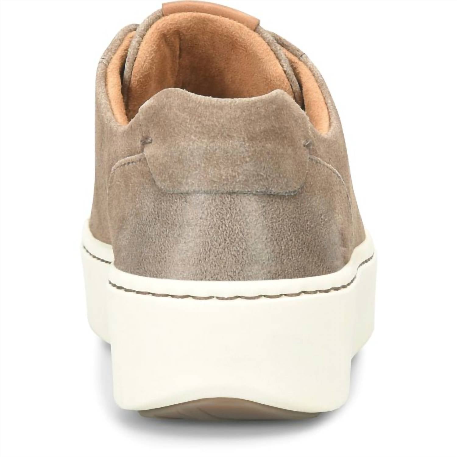 Elevate your casual looks with the Women's Mira Suede Sneaker by Born, a perfect addition to your fall streetwear collection. Handcrafted from soft Italian suede leather in taupe, this sneaker features a platform heel offering a lift with a heel height of 1 3/4 inches and a platform height of 1 1/3 inches. Its round toe shape and breathable micro suede lining provide comfort, while the high traction flexible EVA rubber outsole ensures stability. The inside Opanka handcrafted construction and removable cushioned footbed with extra foam add to its luxurious feel.