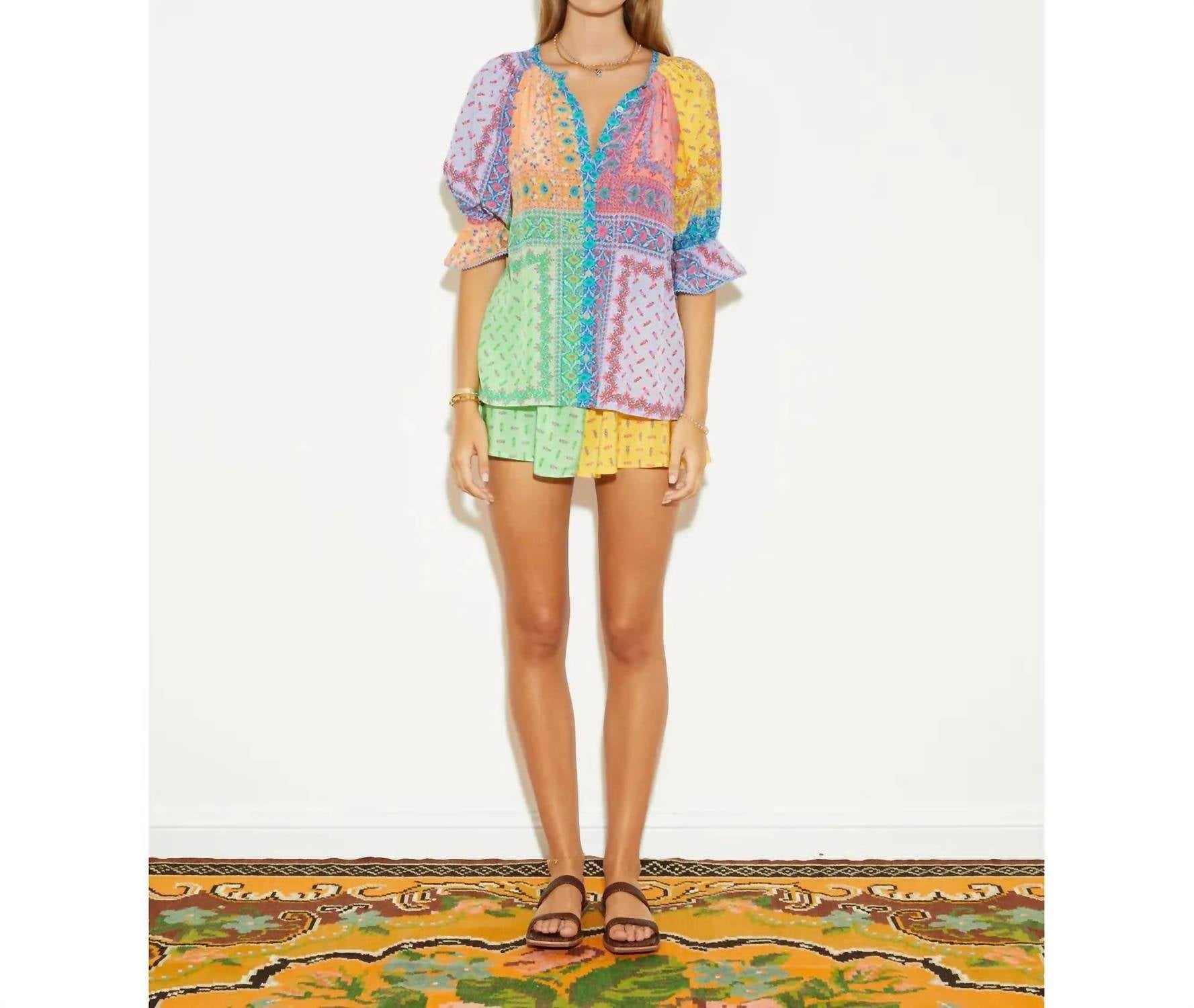 Introducing the Bon Bon Silk Blouse by BOTEH, a vibrant expression of boho chic in a stunning mosaic of pastel colors. Crafted from luxurious silk, this short sleeve smock blouse features a gathered crewneck detail with soft elastic cuffs adorned with fine lace edging. Closure: Antique gold button-through front. Perfect for spring vacations and Easter occasions, this blouse is a quintessential addition for seaside splendor.