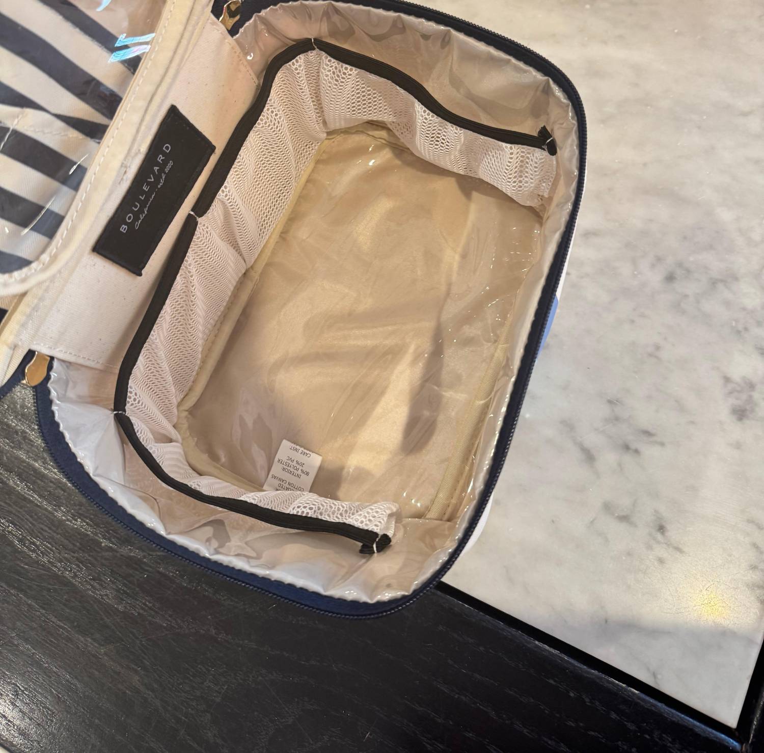 Elevate your travel essentials with the Tricia Canvas Train Case by Boulevard, crafted from durable coated canvas in a chic canvas color. This mid-sized makeup case is thoughtfully designed with a practical brush/pencil organizer and four elastic mesh pockets, ensuring that all your beauty necessities are neatly stored. Material: Canvas. Care instructions: Do not wash.