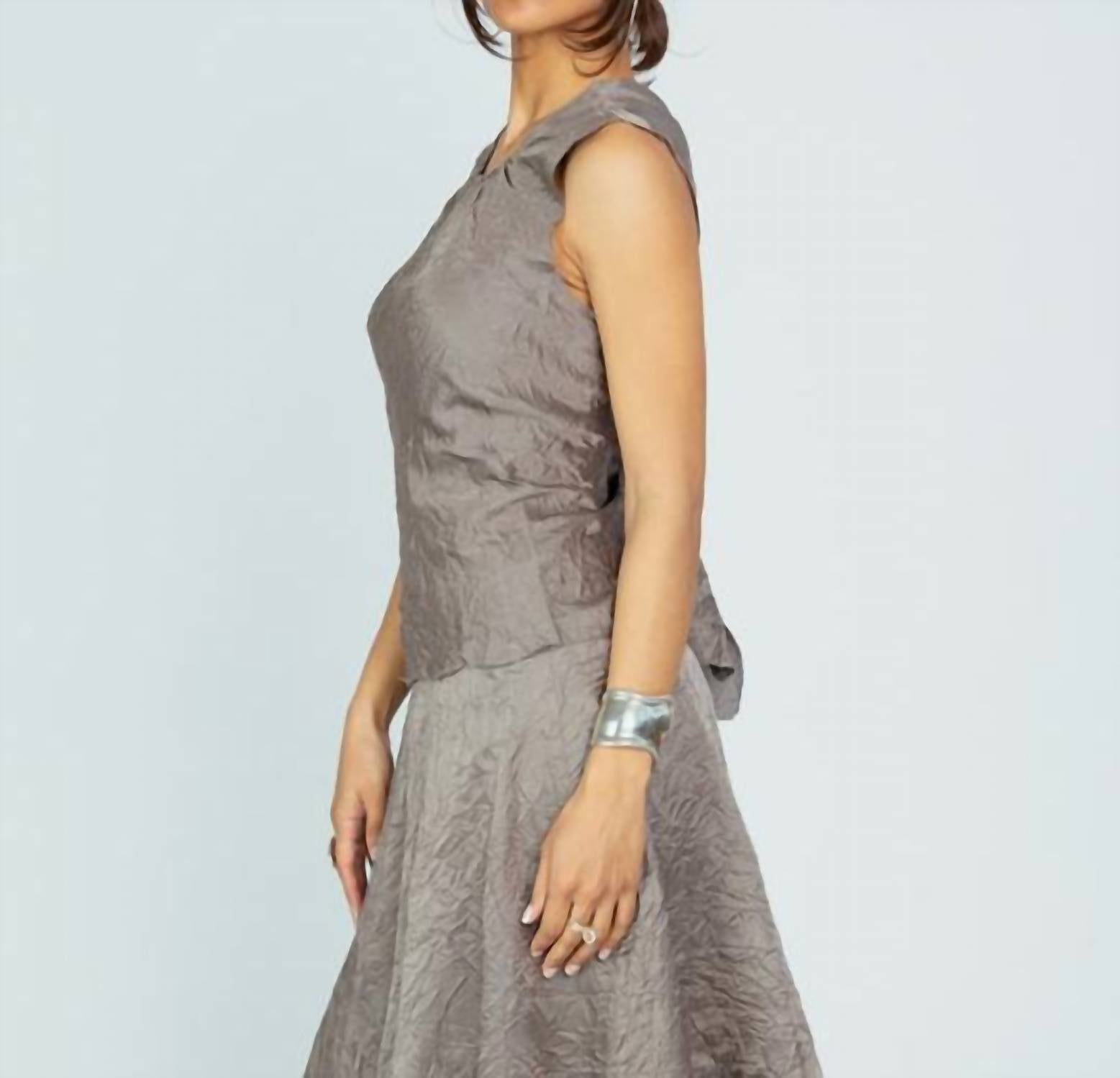 Presenting the Cotton Silk Wrinkle Knotted Back Tank by Brazeau Tricot, an elegant sleeveless top perfect for elevating your style. Crafted from a luxurious blend of 65% cotton and 35% silk, this unique wrinkle fabric offers both comfort and sophistication. Made in China, the top features an open back with a self-tie knot and a convenient single button closure at the round neck. Care for this versatile piece with a hand wash or dry clean for best results.