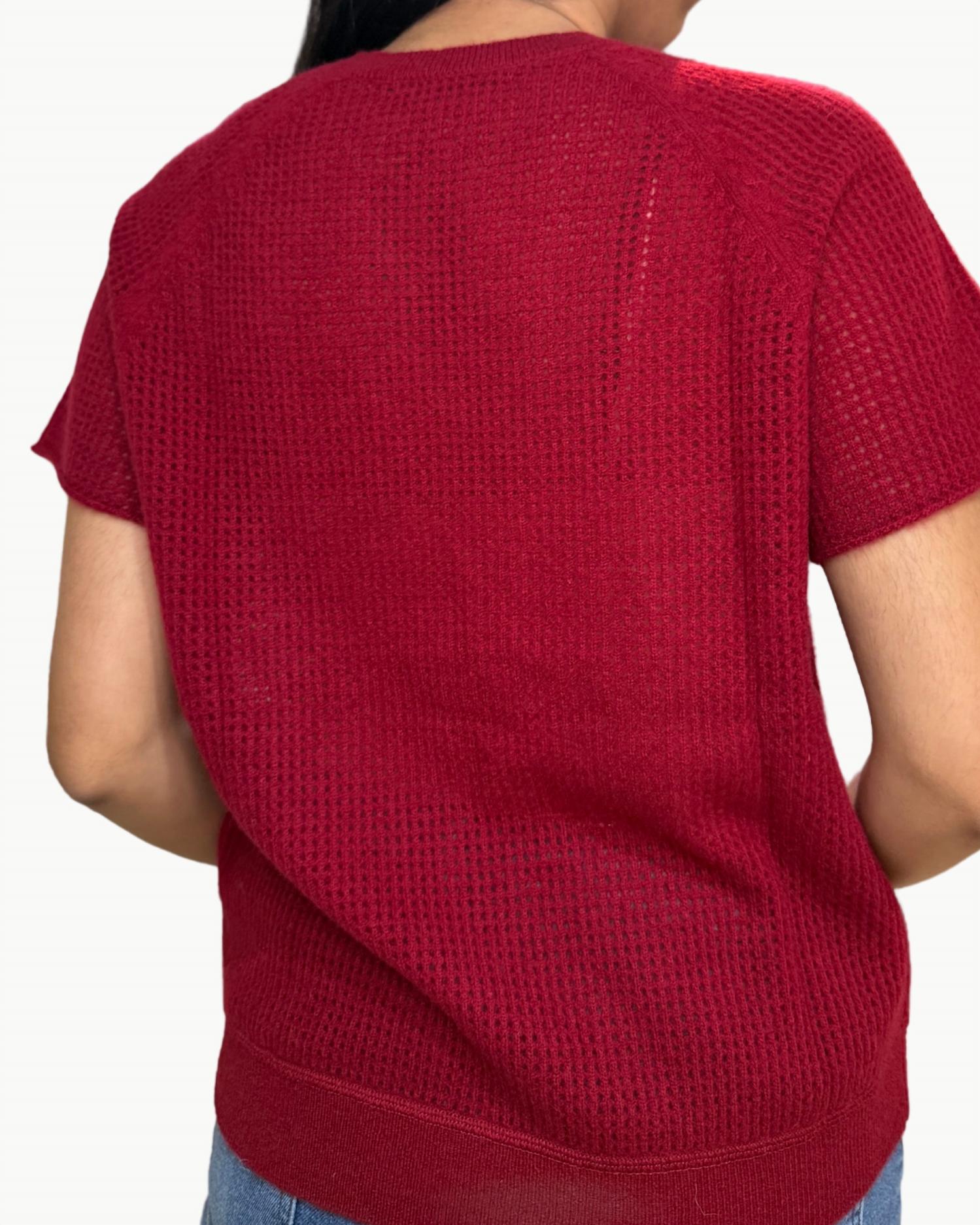 Embrace the luxury of the Short Sleeve Clover Sweatshirt by Brazeau Tricot in a rich claret hue. This sweatshirt features short sleeves, crafted from 100% cashmere, offering a textured and ultra-soft feel that is perfect for effortless layering throughout the seasons. Designed with a relaxed fit and timeless crewneck, it is a versatile piece for stylish travel, embodying a chic nod to 90s fashion. Made for women, this pull-on sweater does not include pockets and offers comfort without the need for specific wash instructions. Model is 5'4" wearing a size S.