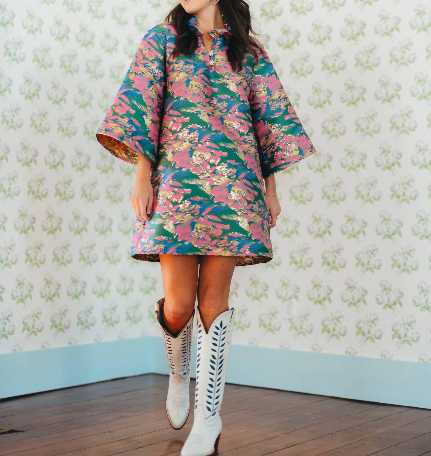 Introducing the Brianna Cannon BC Caftan Dress, a whimsical and sophisticated piece in Baroque Brush Strokes. Crafted from 100% Polyester metallic jacquard and fully lined, this dress features a ruffle collar and practical pockets. Designed for a structured fit with a button closure, it's a timeless nod to 1960s-70s fashion, perfect for a vacation look. Available in a mini length of 34" for Small/Medium and 35.5" for Large/XL, it's a spring-ready kaftan silhouette with a floral pattern. Made in China.