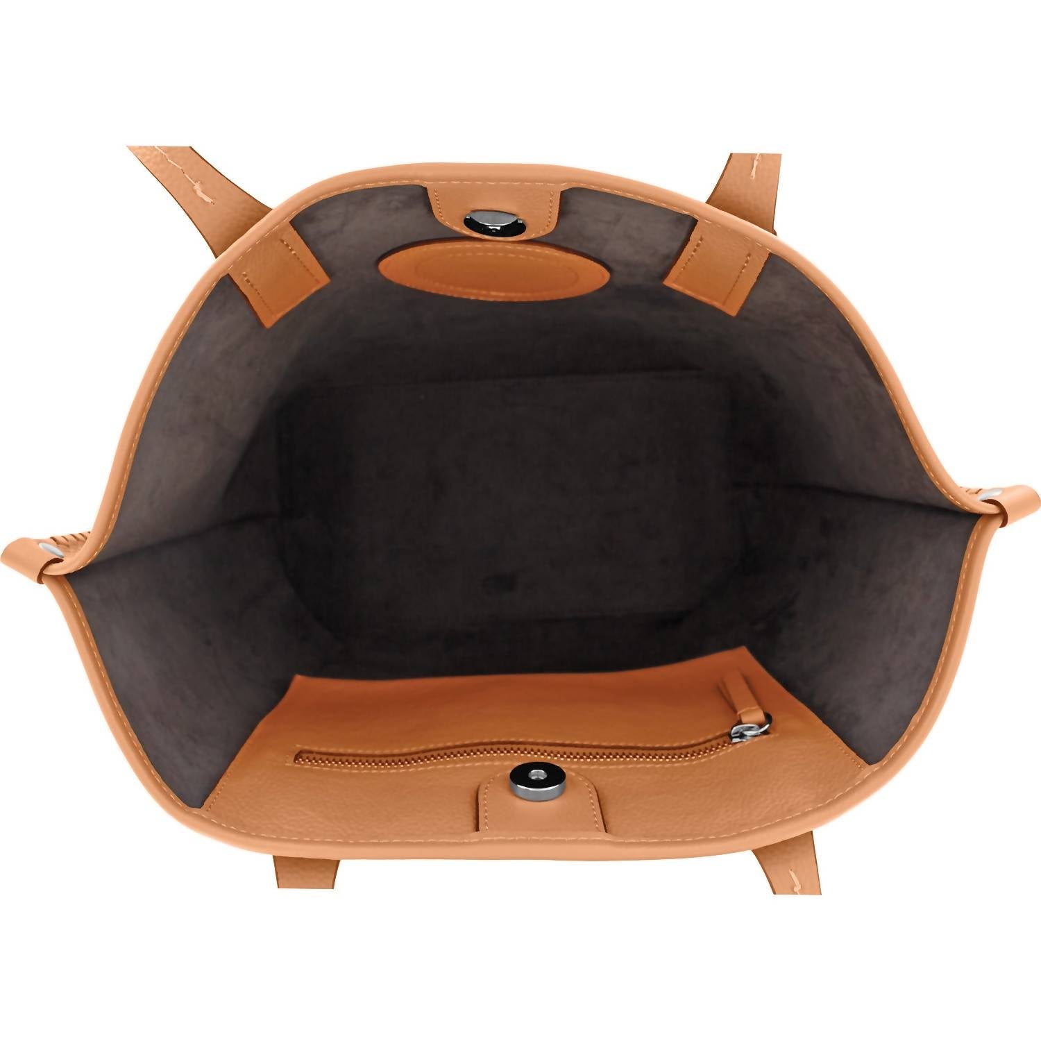 This hand-laced Latigo leather roomy tote features a rich suede-like interior. It has a 9 1/2" strap and measures 11" in width, 11 1/2" in height, and 6" in depth. The tote includes a magnetic top closure. Made from leather with a suede interior lining.