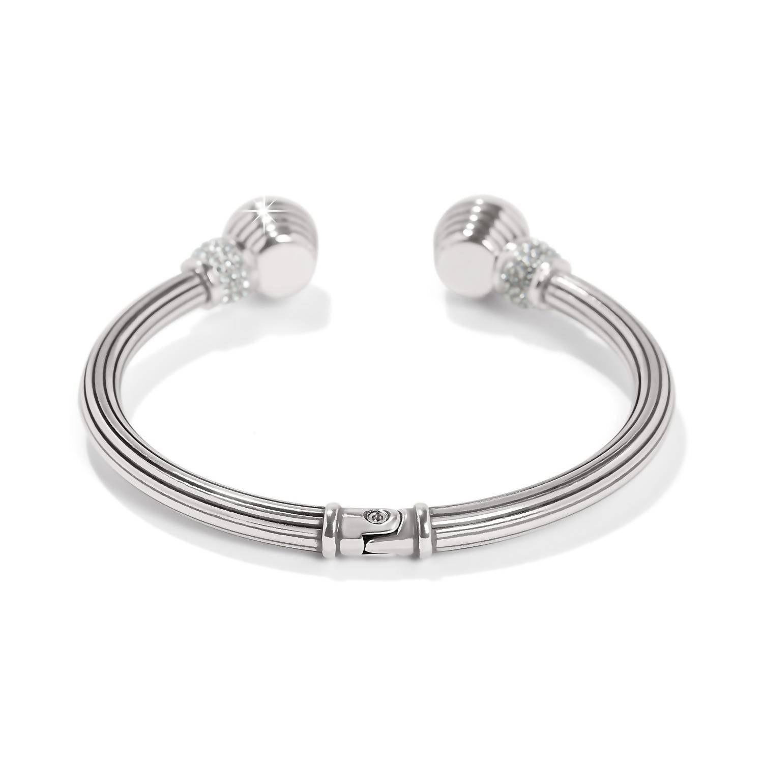 Introducing the Women's Meridian Aurora Petite Hinge Bangle by Brighton, a sophisticated addition to your jewelry collection. With a blend of fine quality crystals, this silver-golden bracelet boasts a silver-plated finish, enhancing its elegance. It features a hinged closure for ease of wear and measures 7/16" in width with a 2 1/4" diameter. Perfect for adding a touch of sparkle and refinement to any ensemble.