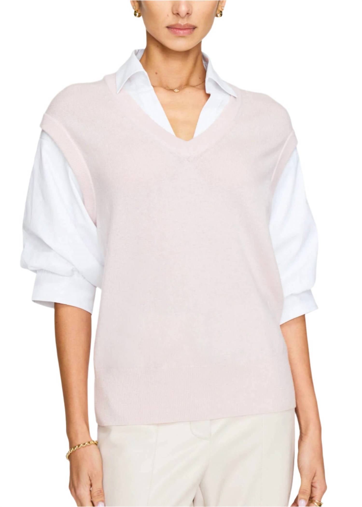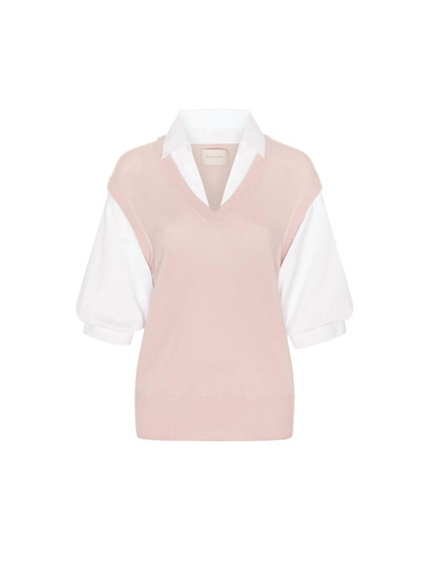 Introducing the Kate Looker Shirt by Brochu Walker, a standout in the Paloma with White Palow colorway that exudes effortless elegance. This stylish piece features elbow-length blouson sleeves and a sophisticated V-neck vest overlay with a pre-layered shirt underlayer. Crafted from a luxurious blend of 70% wool and 30% cashmere overlayer with a cotton blend underlayer, this garment showcases button cuffs and signature ribbed trims. Designed for dinner parties and beyond, the sweater runs true to size with a relaxed fit, made for spring and imported with care.