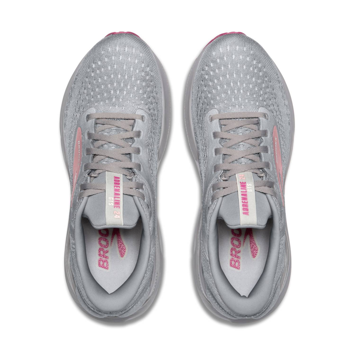 Introducing the Brooks Women's Adrenaline GTS 24 Running Shoes, crafted from recycled materials with a stylish Alloy/White/Zephyr mesh upper. Designed for road running, these athletic shoes weigh 8.8 oz and boast a 12mm midsole drop for optimal performance. They feature nitrogen-infused cushioning for lightweight softness and a supportive GuideRails® system to reduce excess motion. With 62.7% recycled materials in the upper, this footwear embodies the athleisure trend while emphasizing sustainability, perfect for your spring fitness wardrobe.