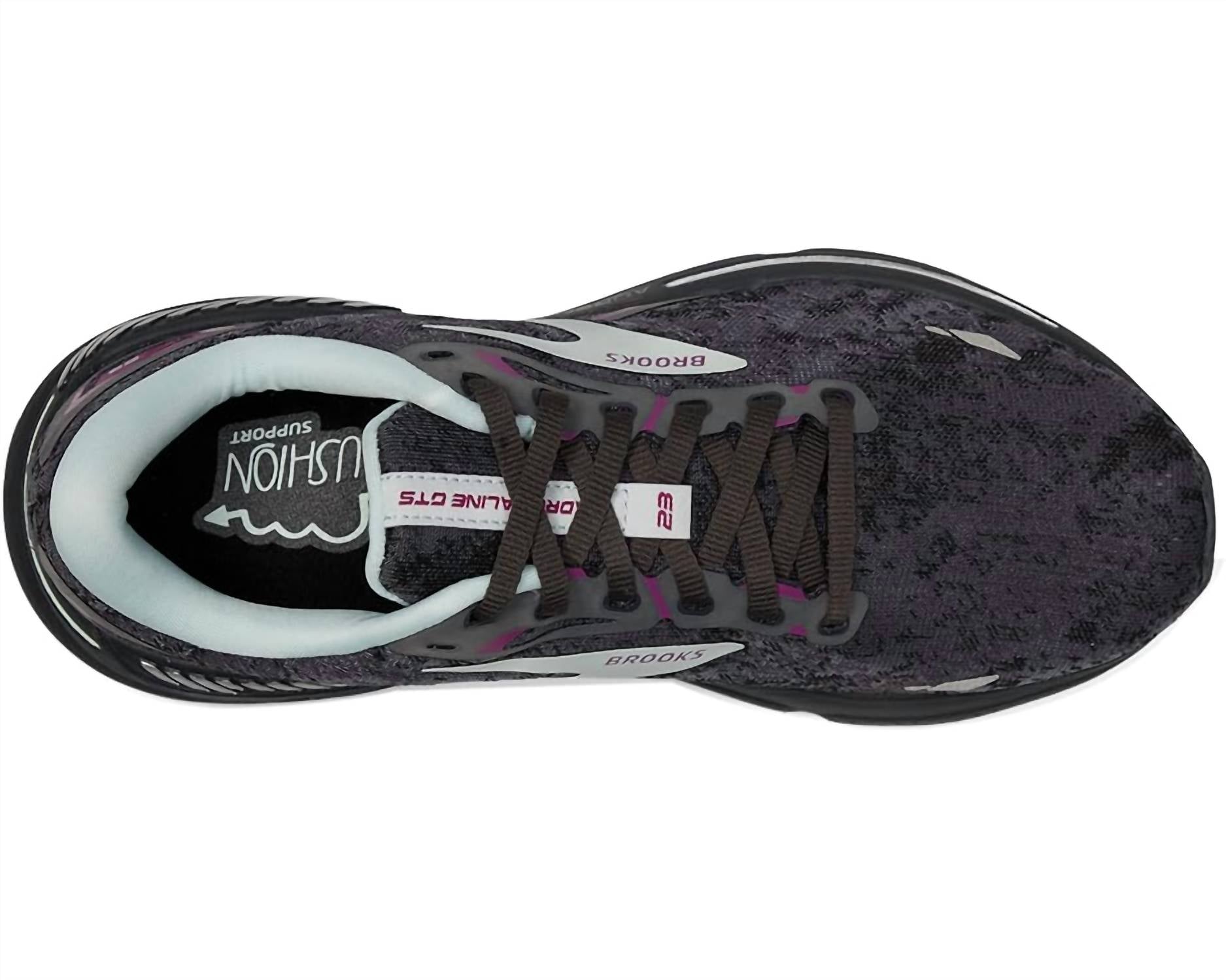 Quando a moda encontra a funcionalidade. Com ajuste aprimorado e suporte inteligente, o tênis Brooks® Adrenaline GTS 23 conta com recursos de alto desempenho. O tênis durável conta com a tecnologia GuideRails®, que adiciona suporte, e amortecimento DNA LOFT v2 na entressola para uma passada confortável. O tênis possui cabedal em malha respirável para respirabilidade e palmilha de espuma removível para máximo conforto. Amortecimento: Mais; um pouco mais para aqueles que gostam de correr ou caminhar com mais maciez. (GTS) O Go-To-Support ajuda os corredores a manter seu ritmo natural, mesmo quando estão cansados. Forro de nylon. Fecho de cadarço. Letras da marca na lateral. Design com bico redondo. Sola de borracha de carbono. Queda do calcanhar aos dedos: 12 mm AMPLA LARGURA