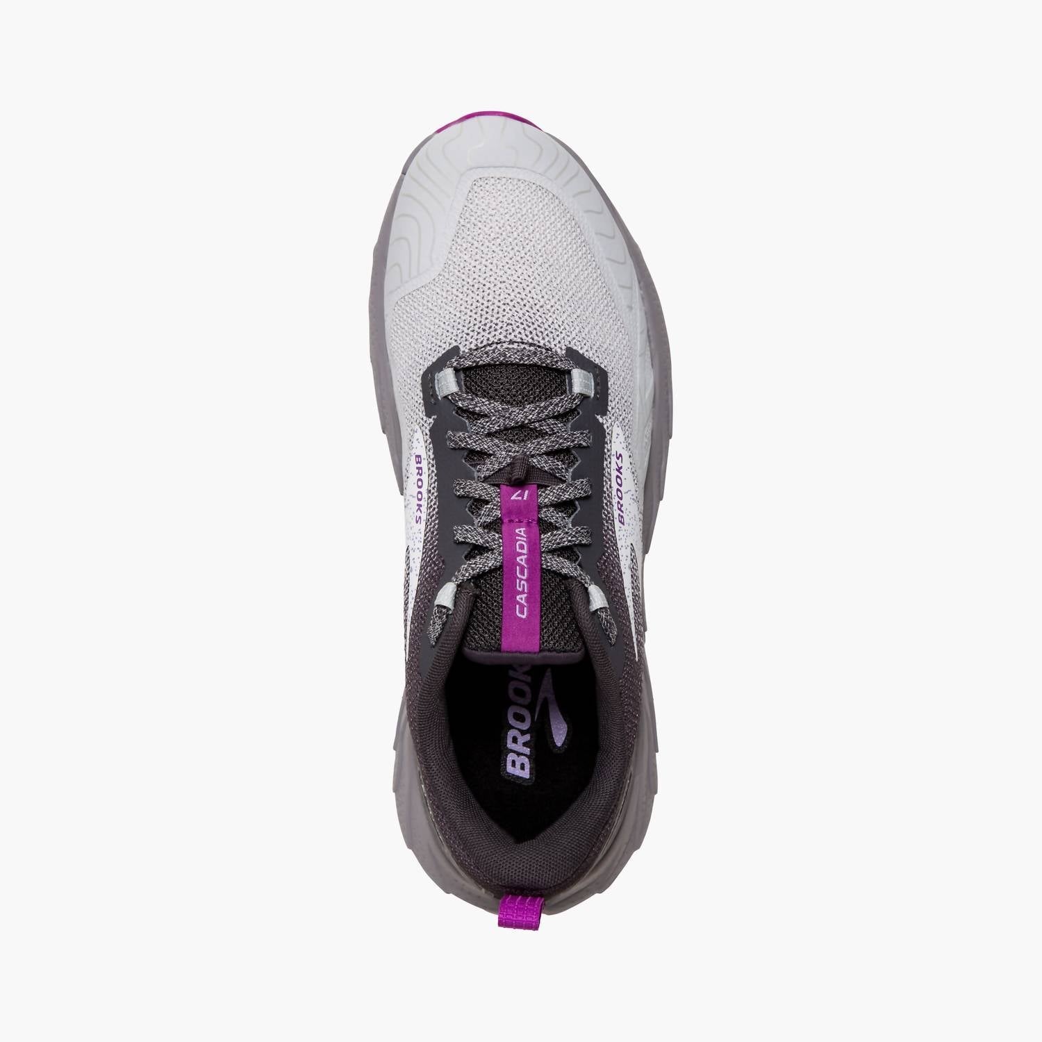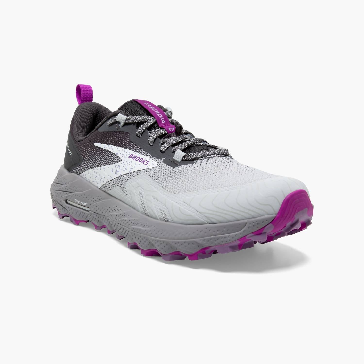 Apresentamos o Tênis de Corrida Feminino Cascadia 17 da Brooks, meticulosamente projetado para elevar suas aventuras em trilhas de montanha. Este tênis combina um formato de bico arredondado e um ajuste de largura média em um impressionante esquema de cores Oyster/Blackened Pearl/Roxo. Com 277,8 g (9,8 oz) e um drop de 8 mm na entressola, ele proporciona maior estabilidade em todos os terrenos, tração e amortecimento macio para o máximo conforto. Feito com 54,2% de materiais reciclados no cabedal, este tênis garante durabilidade com recursos como biqueira protetora e para-lama durável, tornando-o perfeito para corridas de trilha e caminhadas.