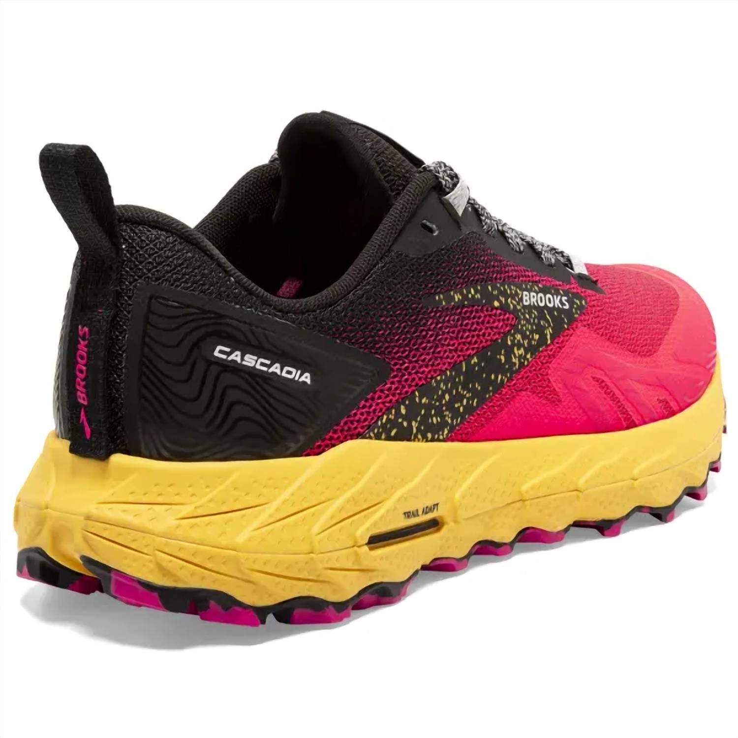 Estilosos, confortáveis e com suporte. Estes tênis esportivos atendem a todos os requisitos. Apresentamos o Tênis de Corrida Feminino Cascadia 17 da Brooks em uma vibrante paleta de tons de Rosa Diva/Preto/Cromo Limão, perfeito para entusiastas do estilo athleisure. Este tênis apresenta cabedal em malha respirável com estampa 3D Fit, feito de materiais reciclados, incluindo aproximadamente 10 garrafas plásticas. Experimente amortecimento e tração superiores graças à entressola DNA Loft v2 e ao solado de borracha TrailTack Green. O sistema Trail Adapt e o Ballistic Rock Shield proporcionam estabilidade e proteção em terrenos variados, ideais para aventuras de caminhada. Projetados para mulheres, estes tênis de largura média apresentam bico arredondado e são feitos para corredores neutros.