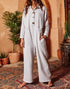 Introducing the French Terry Boxy Button Up Jumpsuit by BUCKETLIST, a chic staple in a soft white, ideal for Summer travels or 4th of July festivities. This jumpsuit features long sleeves, with a versatile cotton blend that combines breathability and comfort. It showcases a regular fit with a relaxed wide leg design, accentuated by a classic collared neckline and full button-up front. With the added convenience of dual patch chest pockets and functional side pockets, this solid, timeless piece ensures an effortlessly stylish and practical look. Care: Machine wash, tumble dry. 75% Cotton, 22% Polyester, 3% Spandex.