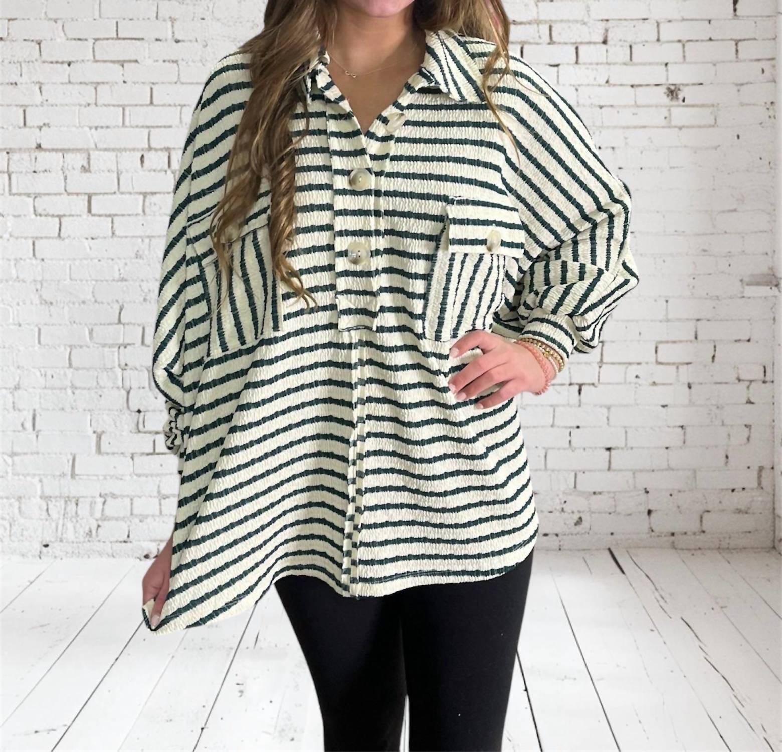 Combine isso com seus jeans e chinelos favoritos para sua próxima noite entre amigas. Abrace o chique streetwear com a Blusa Feminina com Gola e Bolso e Botões da BUCKETLIST, um complemento perfeito para o seu guarda-roupa de férias. Esta blusa de manga comprida com estampa listrada verde apresenta um decote clássico com gola e um prático fecho de botão. Ideal para um look descontraído de verão, esta blusa combina funcionalidade e tendências modernas com naturalidade. Ideal para passeios estilosos ou dias casuais, é uma peça versátil para qualquer mulher antenada na moda.