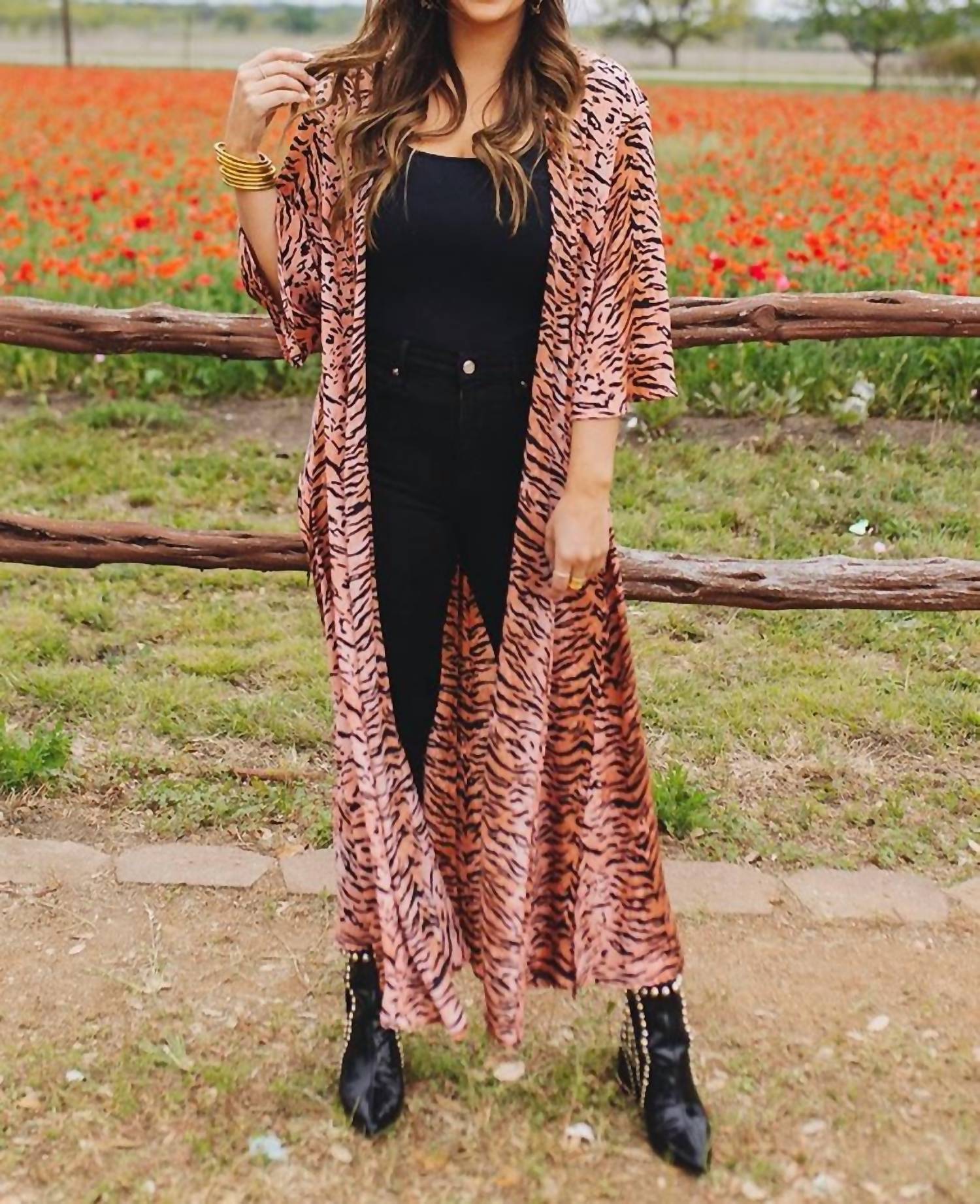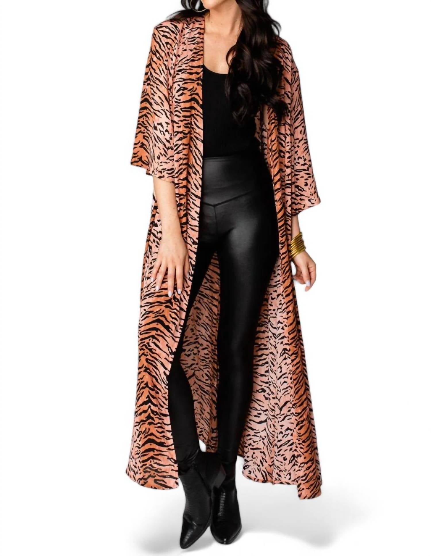 Este sobretudo longo tem mangas até o cotovelo e frente aberta, proporcionando um caimento relaxado. Feito de 100% poliéster, o tecido não tem elasticidade. O caimento é fiel ao tamanho e tem comprimento maxi, com o tamanho P/M medindo 137 cm do ombro à bainha.
