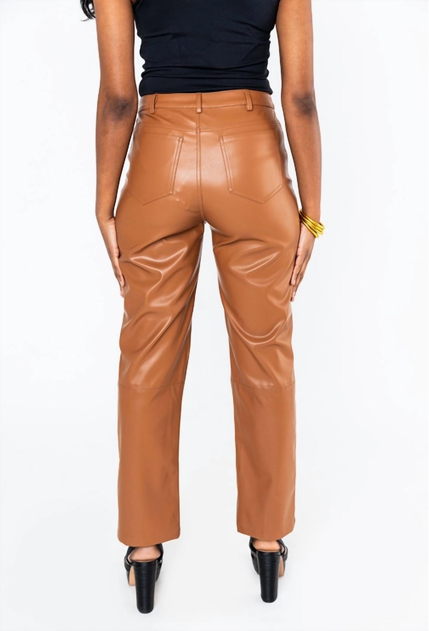 Eleve seu guarda-roupa com a Calça Gomez Vegan Leather Cintura Alta da BUDDYLOVE, uma escolha estilosa em camelo. Esta calça reta tem cintura alta, bolsos funcionais e fecho de zíper para maior praticidade. Ela é confeccionada em uma mistura de 55% poliéster e 45% poliuretano, com forro 100% rayon, oferecendo um toque de elasticidade para maior conforto. Lave estas calças a seco para manter seu visual chique.