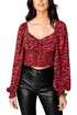 Introducing the Isabelle Smocked Crop by BUDDYLOVE, a chic addition to your fall wardrobe. This long-sleeve top features a stylish animal print in red and a scoop neckline, perfect for pairing with high-rise denim. Crafted from 100% polyester, it offers a comfortable fit with a smocked waist for added stretch. The cropped length measures 11" from shoulder to hem, and the pull-on closure makes it easy to wear. Designed for activewear, this versatile piece is tailored for a true-to-size fit.