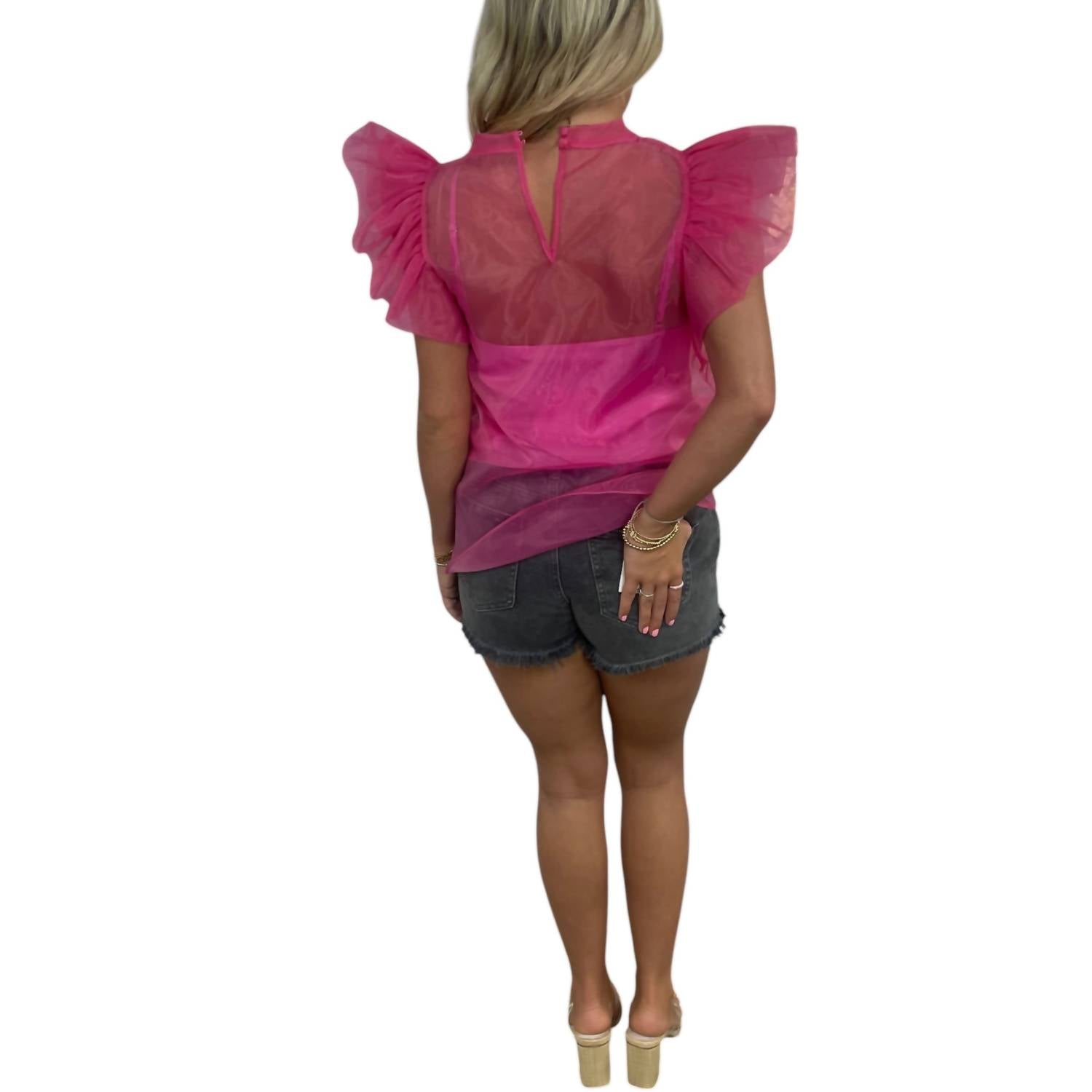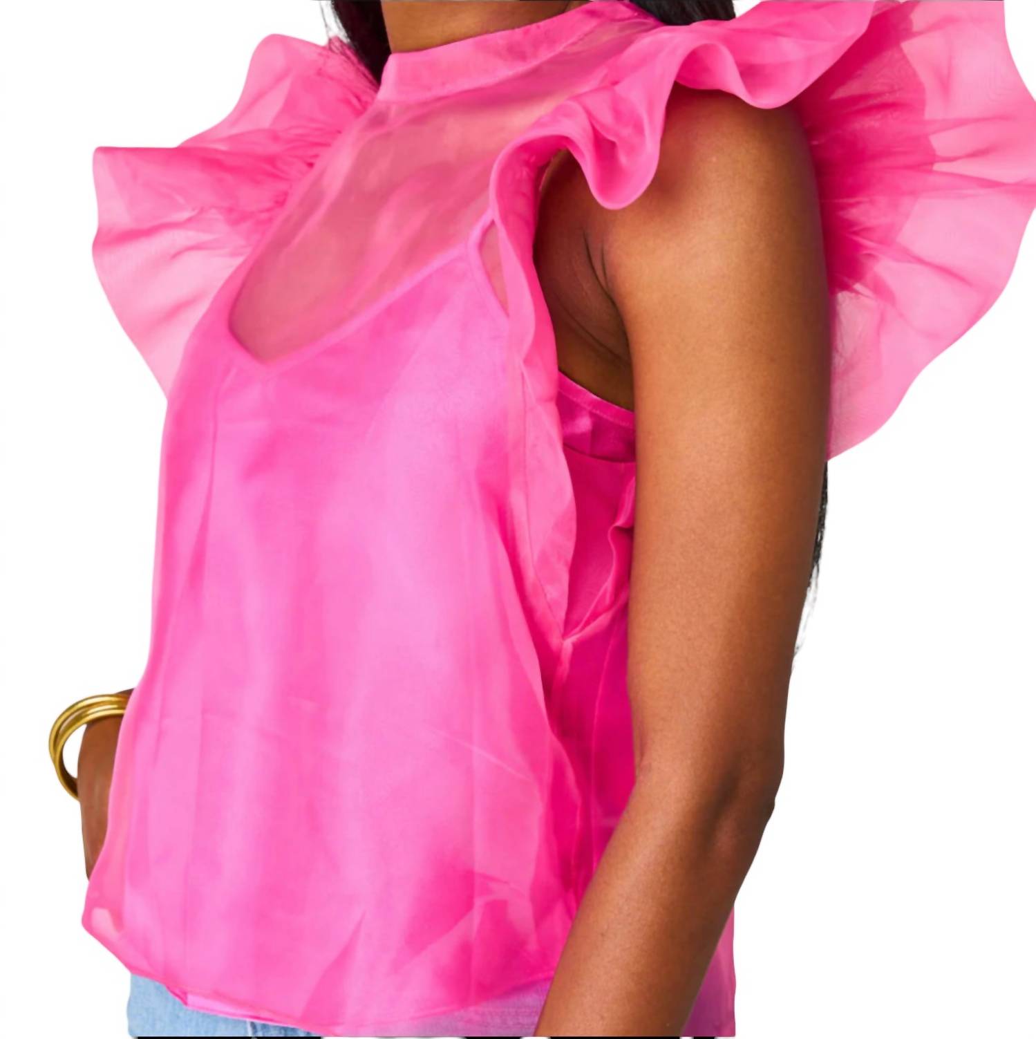 Uma blusa versátil que vai do escritório ao jantar! Feminina, doce e divertida com esta blusa chamativa! A blusa Kaycee apresenta uma estrutura de organza com uma regata de cetim por baixo, fecho de 2 botões e uma manga com babados ousada. O tecido não tem elasticidade. Material: 100% poliéster.