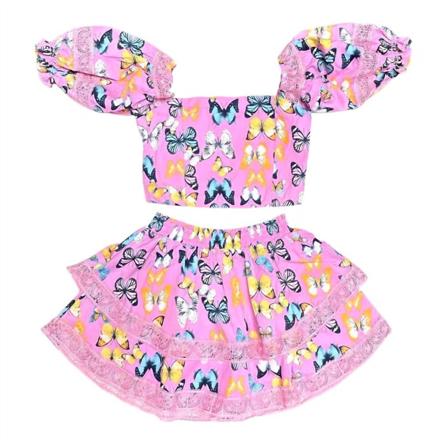 Incremente o guarda-roupa do seu filho com o Conjunto Infantil de Saia Borboletas Simone da BUDDYLOVE, com blusa e saia combinando, adornadas com um charmoso tema de borboletas. A blusa possui mangas bufantes, realçando seu design lúdico, enquanto a saia combinando completa o visual coeso e estiloso. Feito de tecido leve e respirável, este conjunto rosa garante conforto durante o tempo quente e brincadeiras ativas. Este conjunto versátil é perfeito para tornar aniversários, passeios em família ou qualquer dia especial.