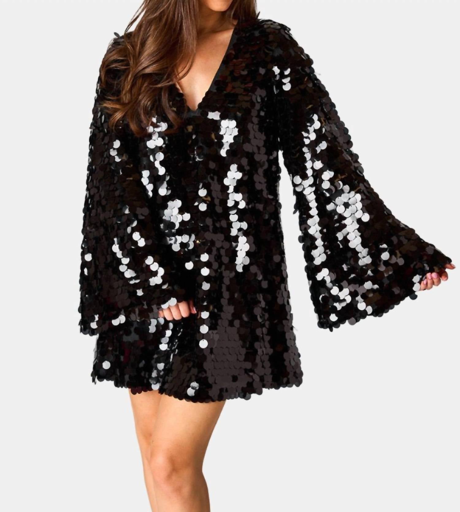 O tipo de vestido fácil e elegante que você vai usar durante toda a estação. O Vestido Curto com Bolinhas Grandes e Lantejoulas da BUDDYLOVE é a peça-chave para qualquer festa de fim de ano. Este deslumbrante vestido preto apresenta mangas compridas e um corte em A elegante, adornado com lantejoulas texturizadas com bolinhas grandes para um visual maximalista. Feito em acrílico, ele apresenta um decote em V chique e é perfeito para ocasiões de outono, como o Dia de Ação de Graças. Eleve o estilo do seu evento com este design sem bolsos, feito sob medida para um visual glamouroso e atraente.