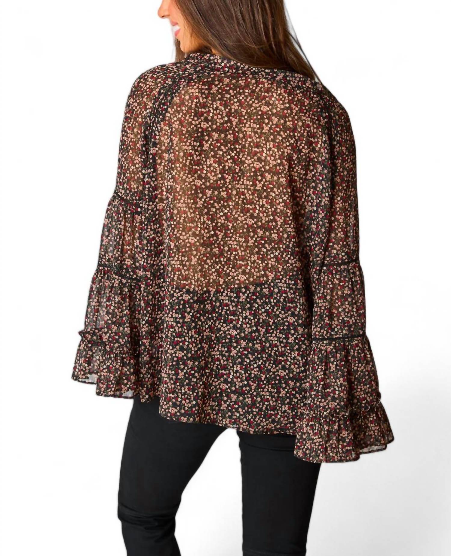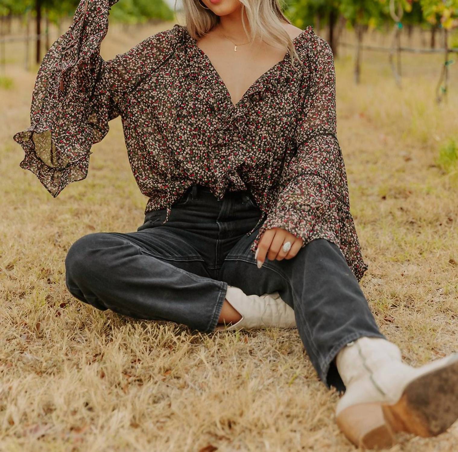 Uma blusa atemporal que nunca sai de moda. Esta blusa possui mangas sino, detalhes de babados, caimento solto e elegante, além de decote em V. Confeccionada em 100% poliéster, o tecido não tem elasticidade. Possui caimento solto e modelagem levemente oversized, com o tamanho pequeno medindo 59 cm de comprimento.