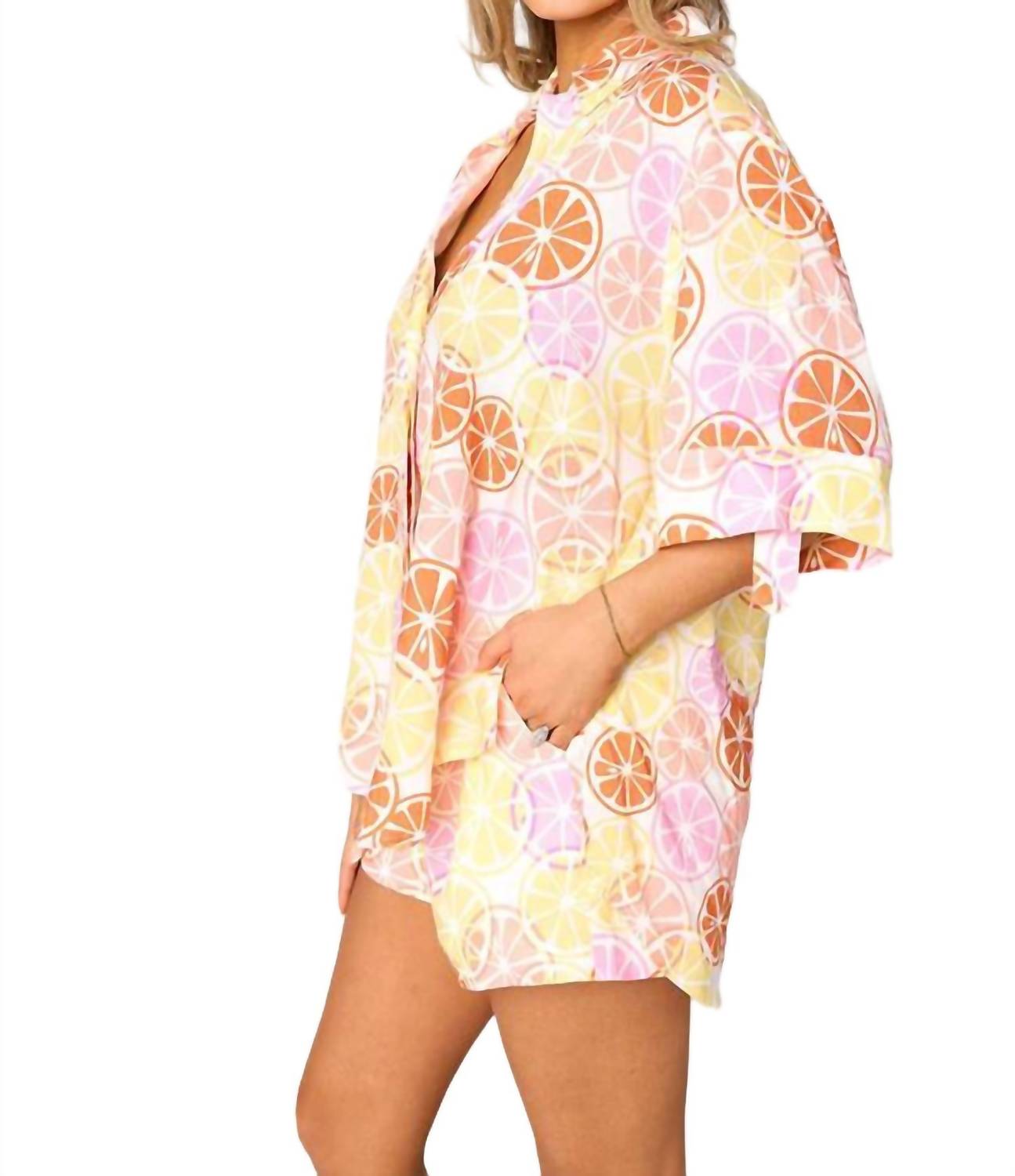O look Miffy inclui uma camisa oversized clássica com botões funcionais e shorts combinando com cós elástico e bolsos. O modelo é leve e sem elasticidade, veste perfeitamente, a blusa fica na altura dos quadris, acomoda a maioria dos tamanhos de busto, a calça fica na altura do meio das coxas e tem um caimento solto.