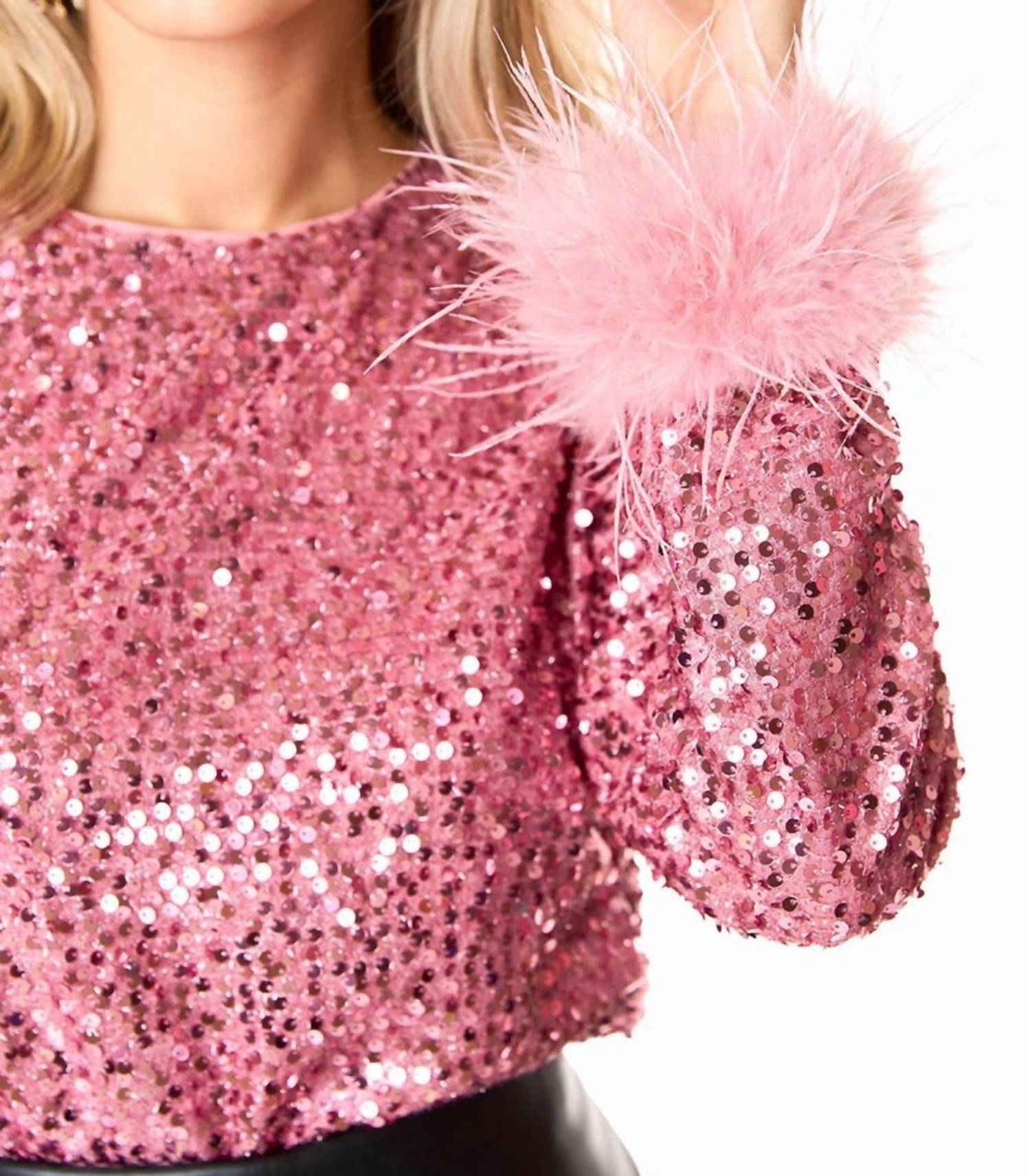 Uma blusa atemporal que nunca sai de moda. Esta peça de manga comprida deslumbra com um corpo todo em lantejoulas e punhos de penas, complementados por um interior confortável e totalmente forrado. Confeccionada em 100% poliéster, tanto na parte interna quanto no forro, mede 52 cm do ombro à bainha. A blusa possui gola redonda e estampa texturizada, finalizada com fecho de botão para um ajuste elegante.