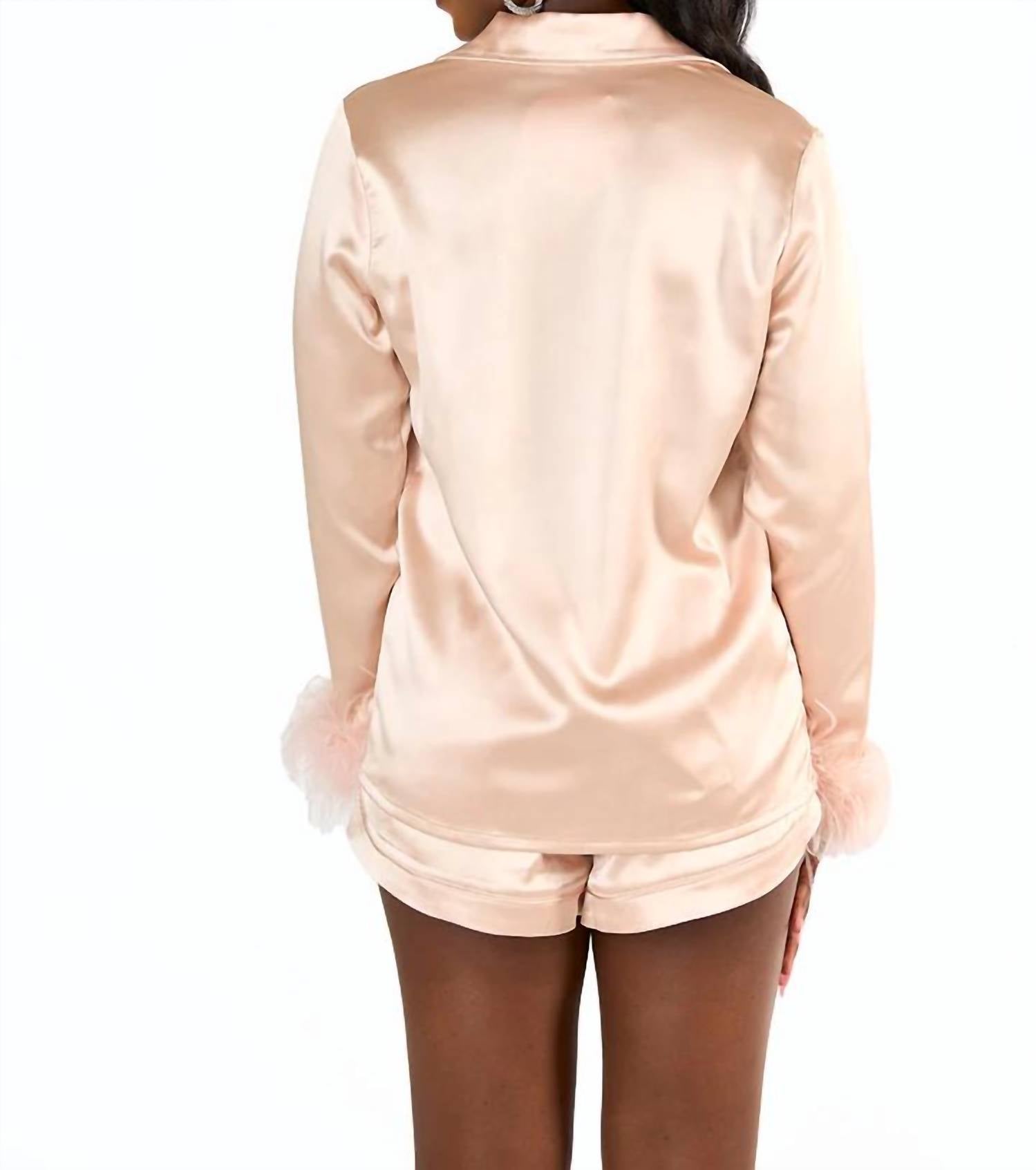 Fuga luxuosa. Adornada em um elegante tom champanhe. Ultramacia com um elegante design abotoado. Com gola chique e mangas compridas. Acabamento em delicados punhos de penas removíveis. Combina com shorts aconchegantes com amarração na cintura. Cós elástico. Confeccionada meticulosamente em 100% poliéster. Toque sedoso em contato com a pele. Tamanho real e caimento relaxado.