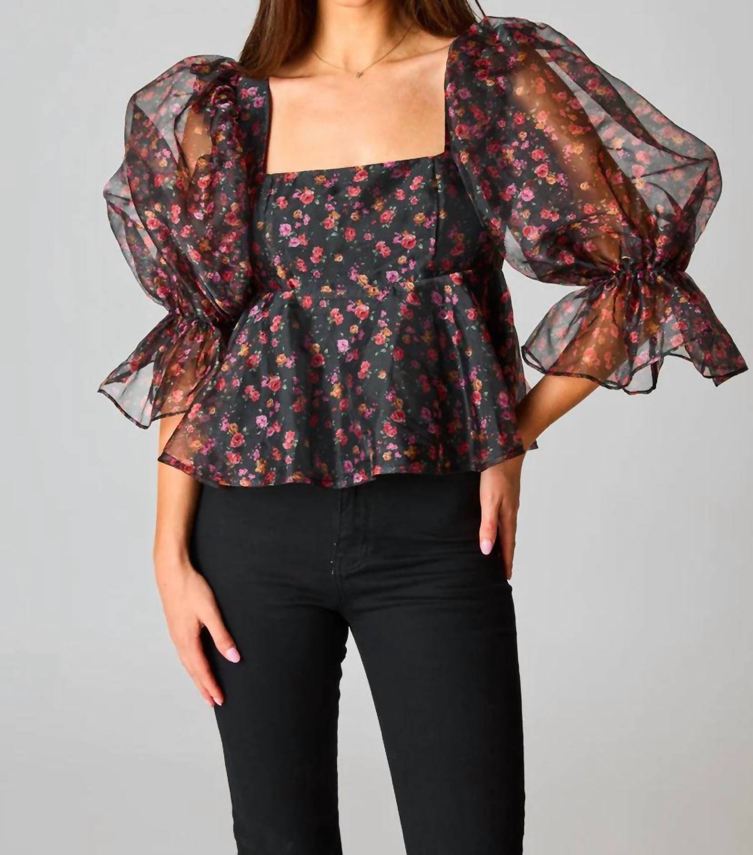 Blusa floral fantasia. Mangas curtas bufantes. Costas franzidas. Modelagem justa ao corpo. Caimento solto. Tecido sem elasticidade. 100% poliéster.