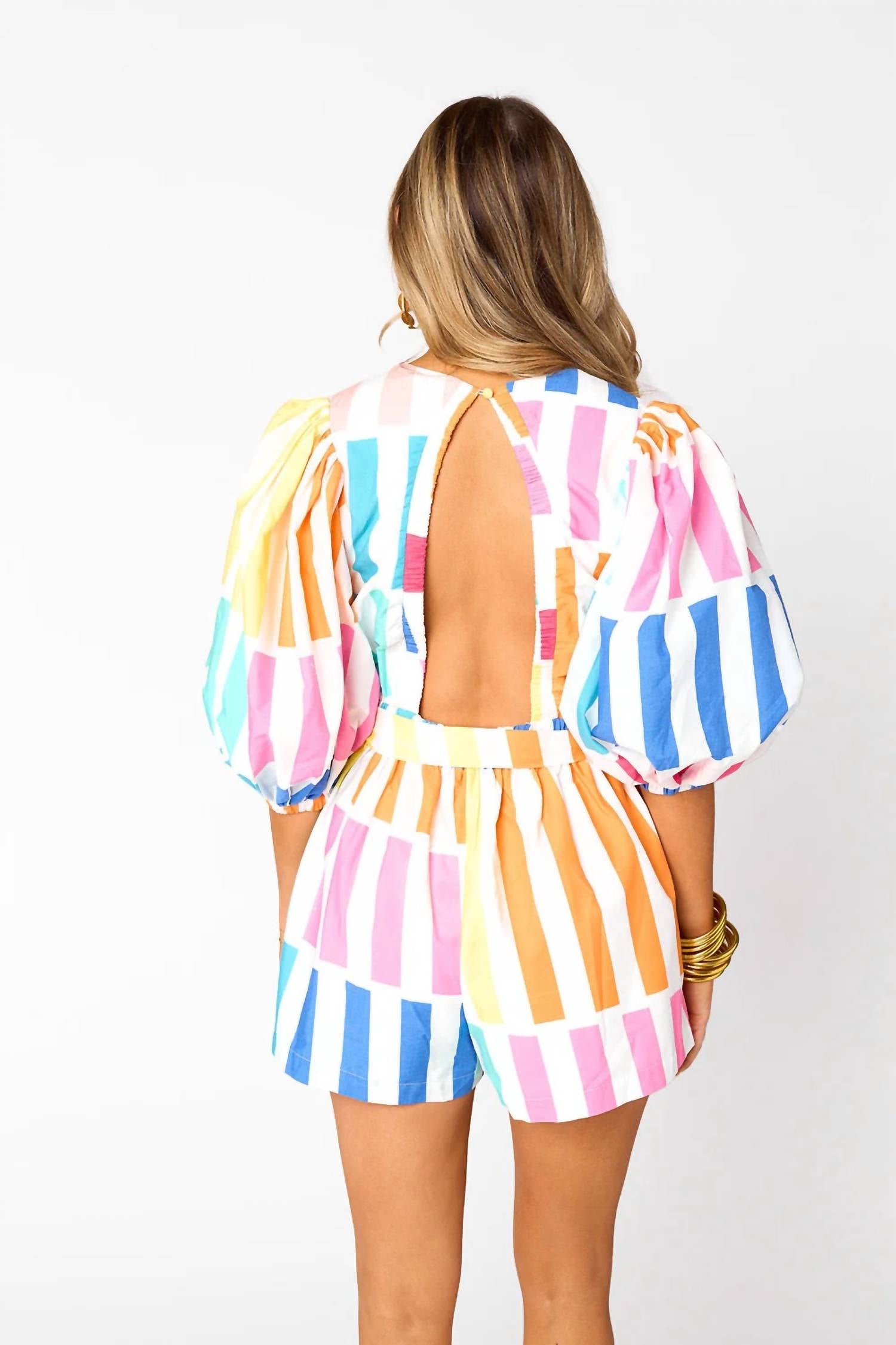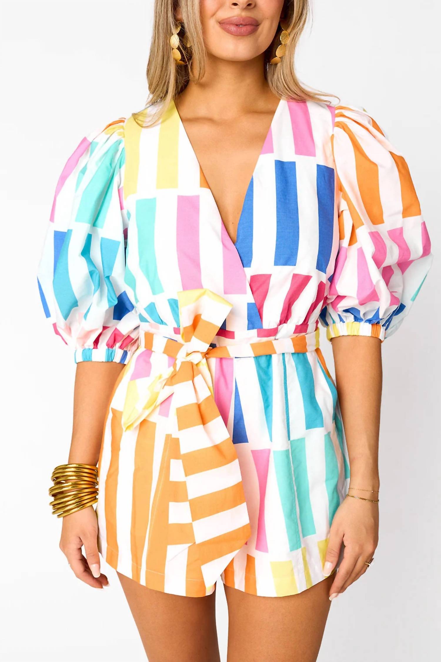 Vista e vá! Apresentamos o Macacão Julia Newport da BUDDYLOVE, uma adição deslumbrante a qualquer guarda-roupa de verão. Este macacão feminino apresenta mangas bufantes soltas e costas abertas charmosas, confeccionado em algodão respirável com um vibrante padrão geométrico multicolorido. Com fecho prático de amarrar na cintura elástica e bolsos para maior praticidade, oferece estilo e conforto. Observe que as instruções de cuidado não são especificadas.