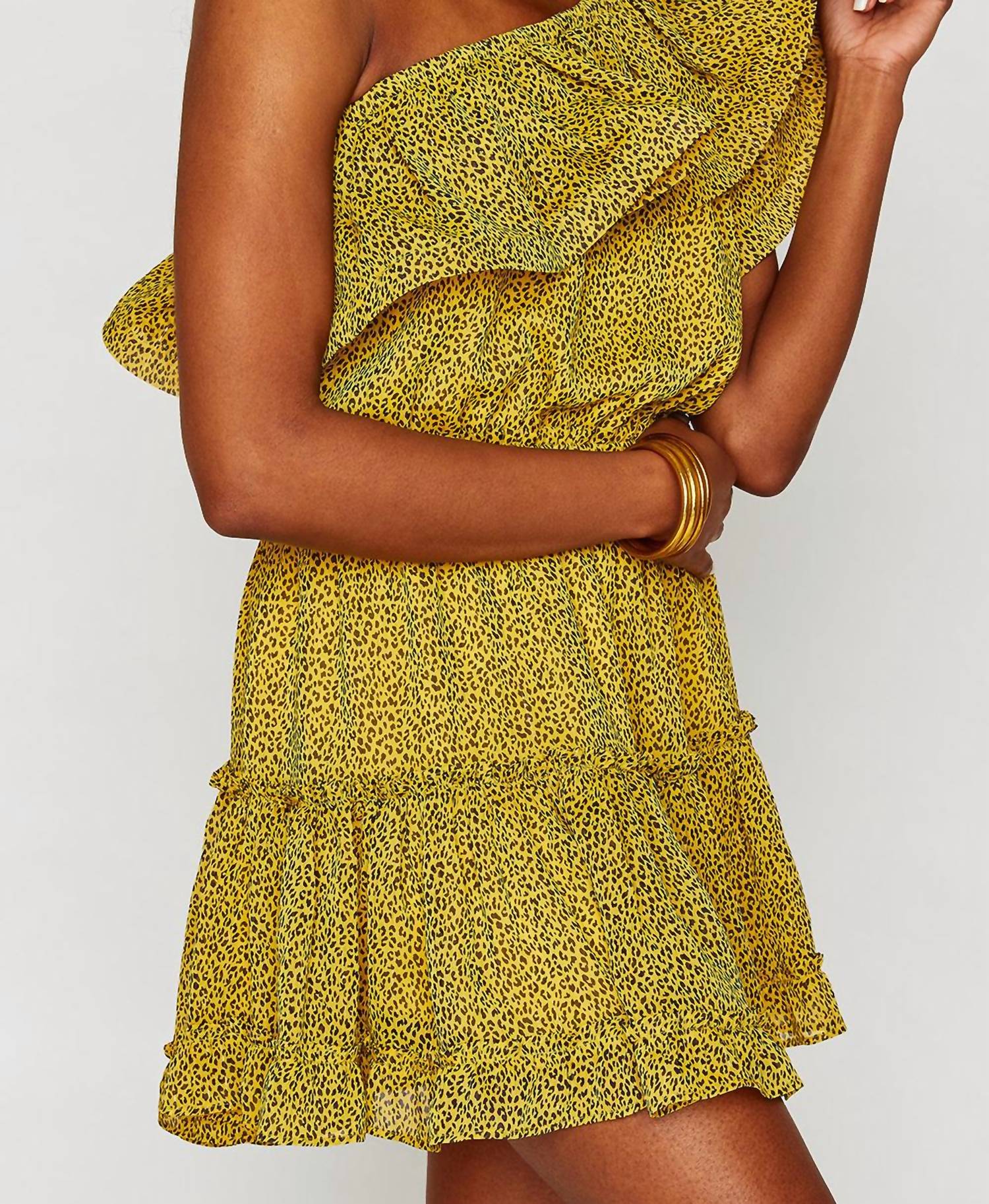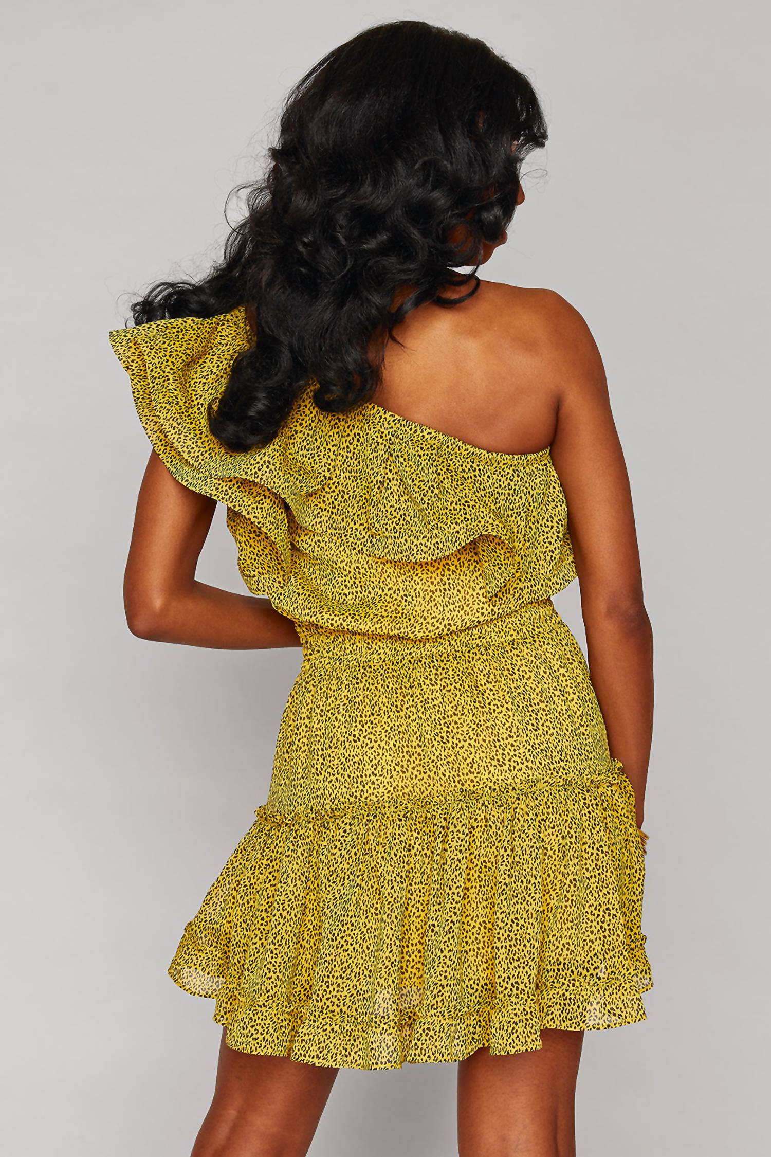 Apresentamos o Mini Vestido Sofia com Babados e Um Ombro da BUDDYLOVE em uma vibrante estampa animal print amarela. Este vestido sem mangas evasê é confeccionado em 100% poliéster, com um design dramático de babados ombro a ombro, cós elástico e saia com babados em camadas. Com 78 cm de comprimento do ombro à bainha, ele promete um caimento relaxado no busto e nos quadris, além de uma cintura ajustada para uma silhueta elegante. Esta peça não possui fecho, proporcionando um uso fácil e confortável, perfeito para qualquer ocasião.