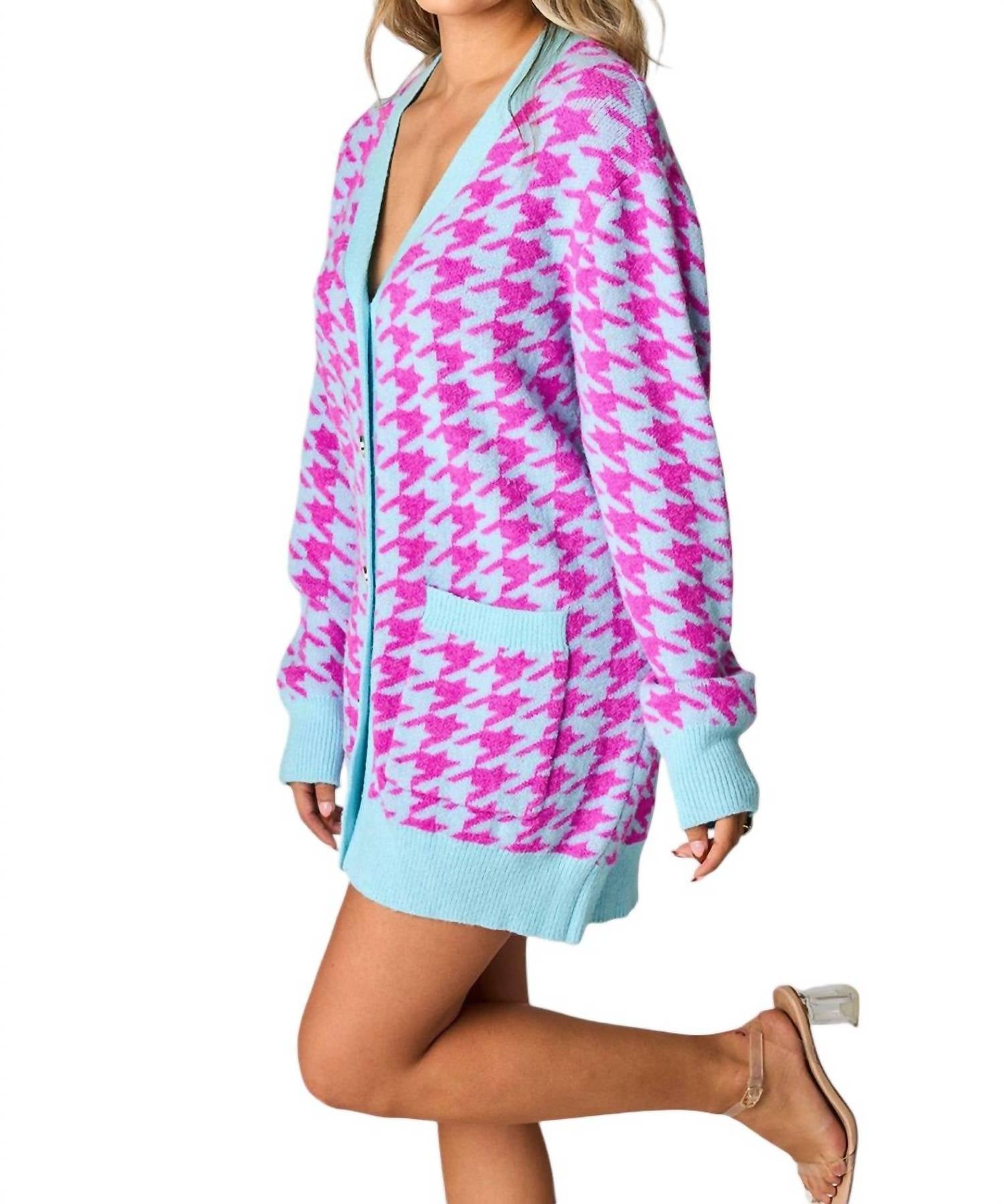 O minivestido perfeito para os meses mais quentes. Este minivestido, que também pode ser usado como cardigan, apresenta um padrão pied-de-poule em malha elástica. Inclui dois bolsos frontais funcionais e um fecho de botão de pérola funcional na parte frontal. Com um corte relaxado e ligeiramente oversized, mede aproximadamente 73 cm de comprimento nos tamanhos P/M.