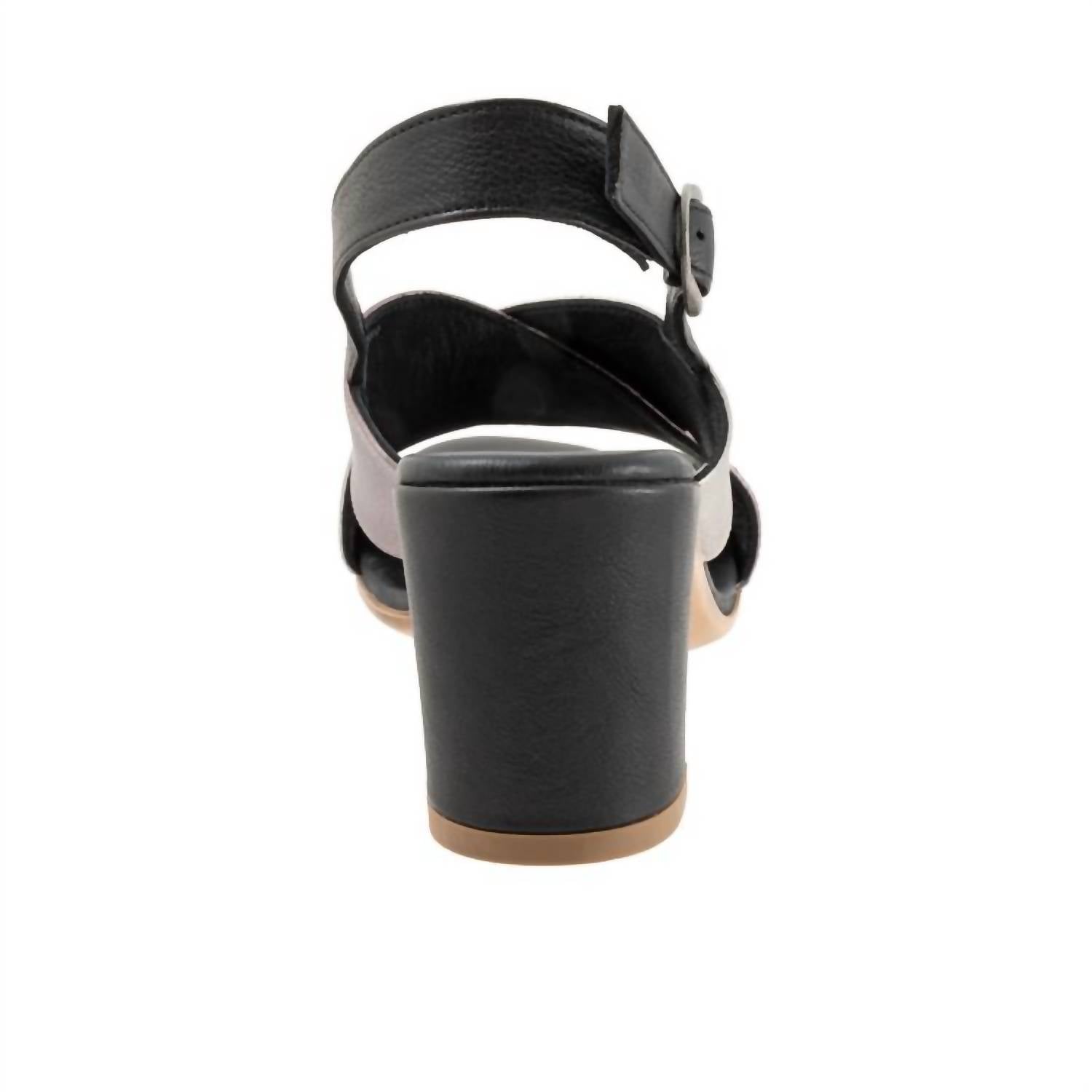 Striking mix of colors with criss-crossing straps and a chic metallic multi finish. Crafted from a leather upper with leather upper lining. Boasts a leather-lined footbed. Adjustable buckle and 2 1/2" color-matched block heel ensure both style and fit. Synthetic rubberized sole provides excellent traction.