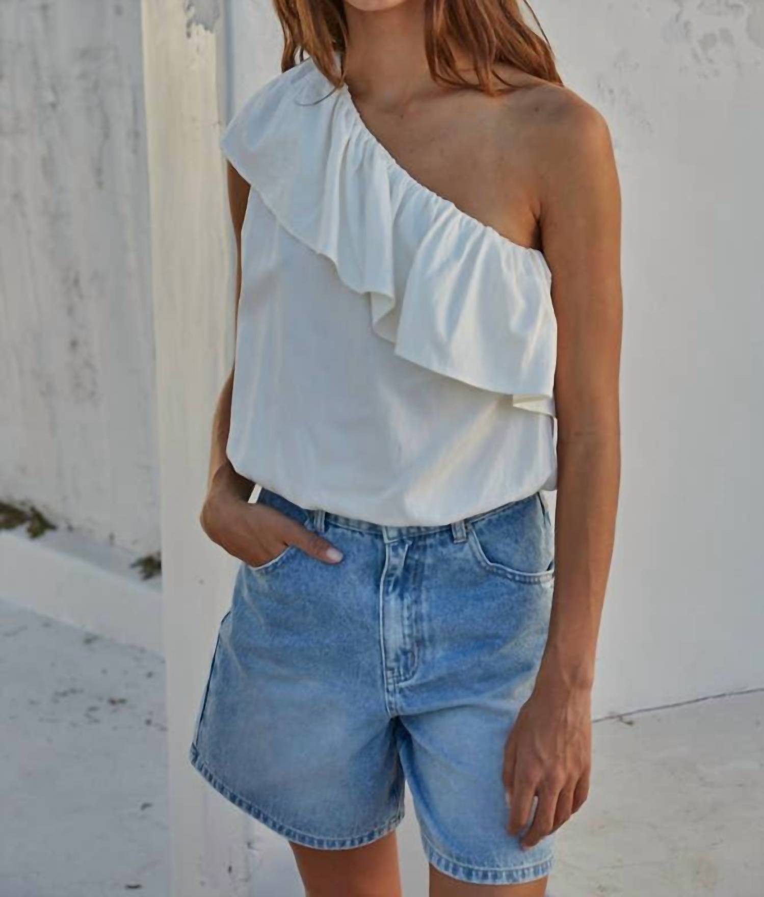 The Ellie One-shoulder Top by By Together is a chic addition to your summer wardrobe in elegant ivory. This sleeveless top is crafted from a 50% cotton, 50% nylon blend, featuring a unique one-shoulder design with layered ruffles and an elastic waistband for a flattering fit. Closure is a pull-on style. Care for this item includes hand washing and line drying to maintain its quality.