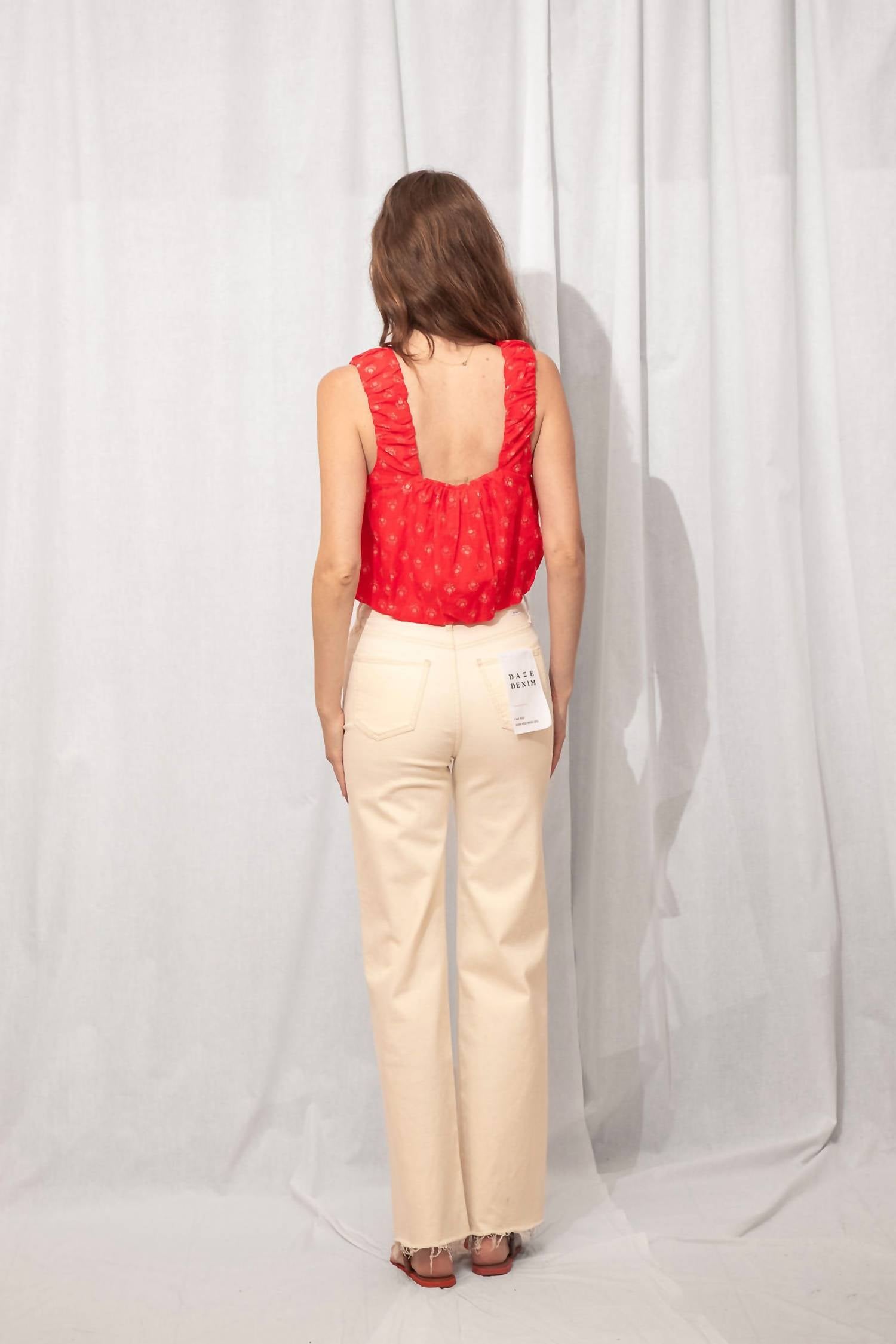 Meet the Krista Bubble Crop Top by By Together, your new summer favorite in a playful red-coral hue. This sleeveless top showcases a charming square neckline with a v-neck slit and front tie detail, crafted from woven cotton for a lightweight feel. The cropped length features a bubble hem, perfect for pairing with high-waisted denim or a breezy skirt. Care is straightforward with a pull-on closure, suitable for machine wash and line dry.