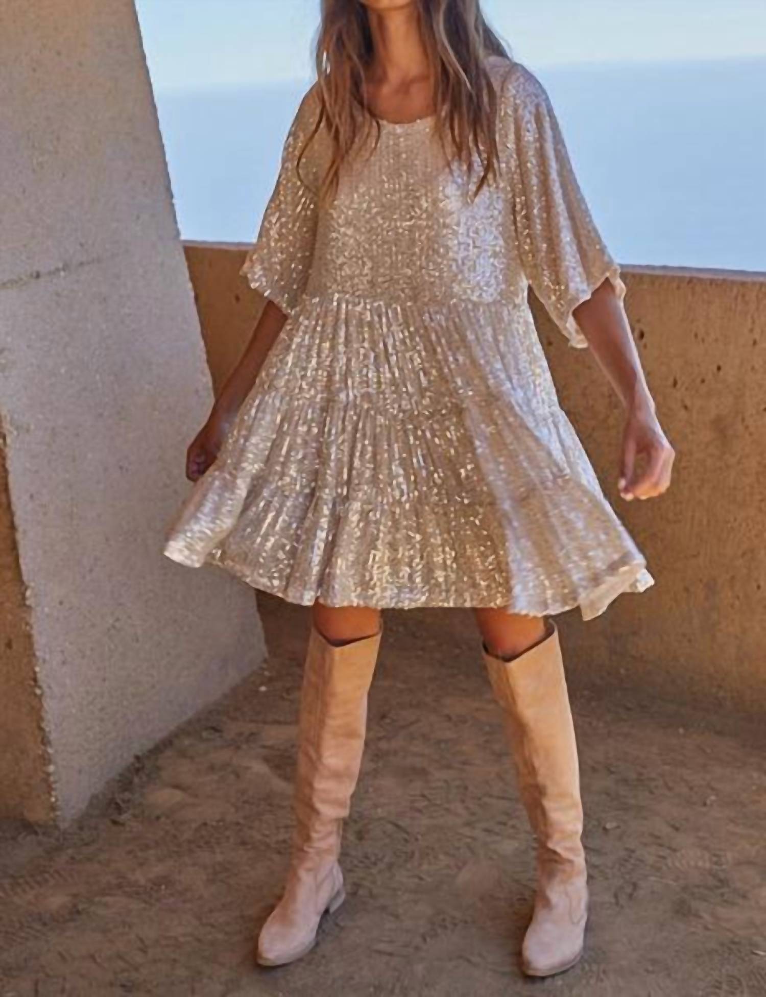 Step into a world of whimsical romance with the Make Magic Sequin Mini Dress by By Together. This A-line dress, with its short sleeves and textured pattern, is artfully crafted from 100% polyester with a comfortable 100% rayon lining. Designed in an eye-catching gold and silver combination, it's a maximalist statement piece perfect for a stylish holiday party. Featuring a scoop neck and a convenient pull-on closure, it ensures ease of wear, while care is straightforward with hand wash and line dry instructions.