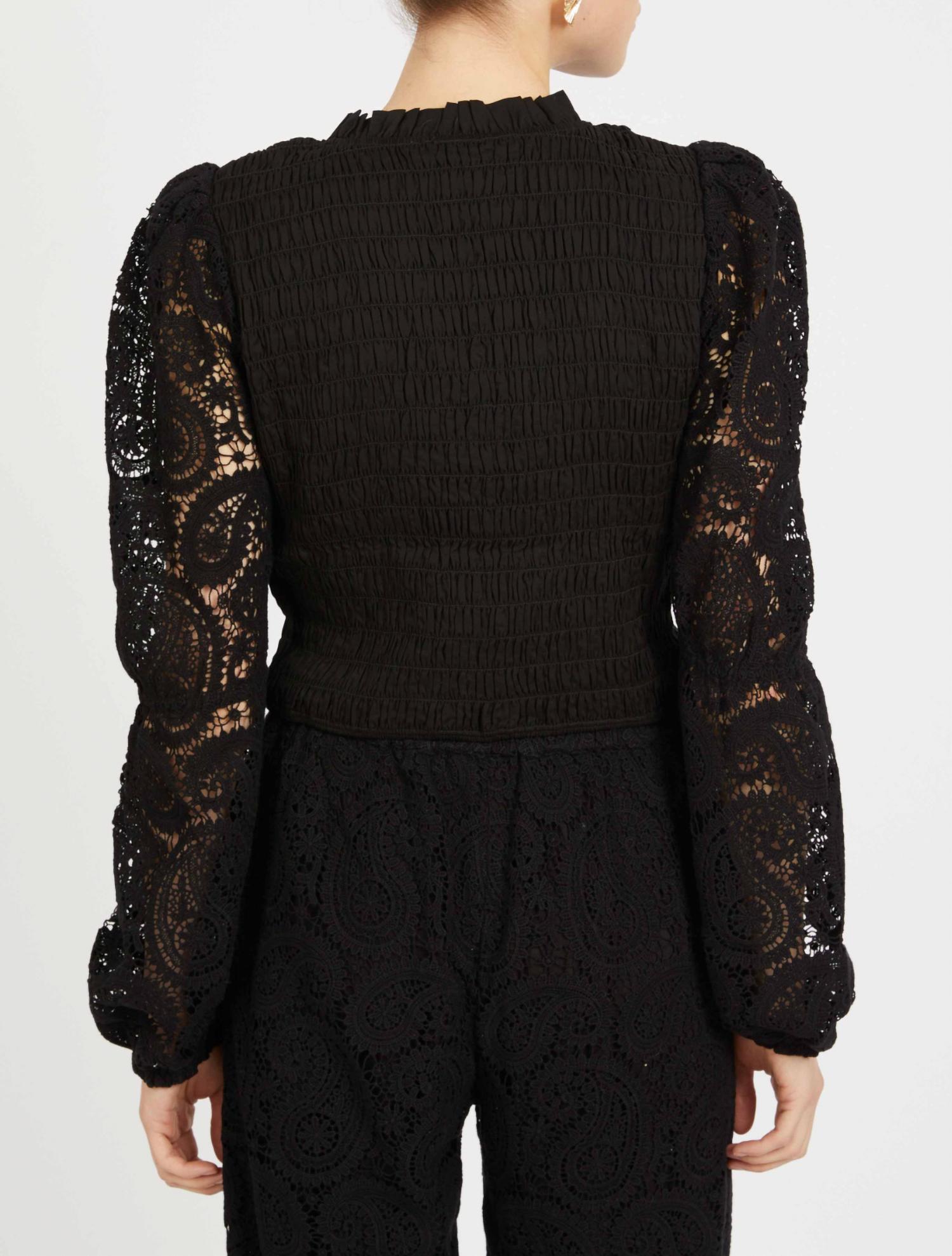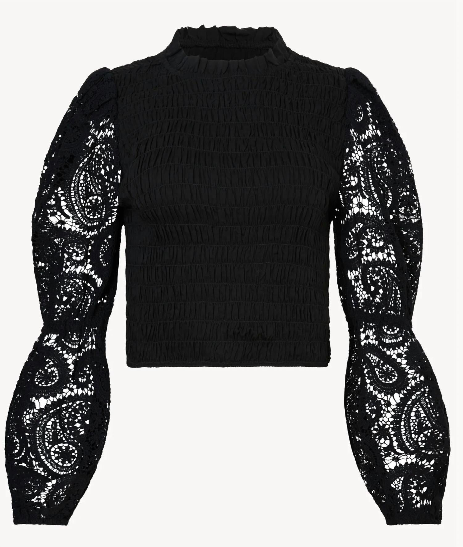 Elevate your wardrobe with the Arabella Long Sleeve Top by CABALLERO, a chic black blouse perfect for any occasion. This women's piece boasts a flattering silhouette with an allover smocked texture, enhancing its stretch and structure. Made for elegance, the top features sheer lace long sleeves with soft bubble detailing, complemented by a subtle crewneck. Easy care instructions keep it as refined as it looks: hand wash and lay flat to dry. Ideal for holiday parties or a day-to-night transition.