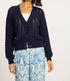 Introducing the Casey Peacoat Sweater by CABALLERO, a chic addition to your wardrobe in a rich navy hue. This women's V-neck sweater boasts long sleeves and a cropped fit, amplified by a textured finish for added style. Made from cotton, it features a convenient button closure, perfectly suited for versatile layering. For best maintenance, dry clean only. Model is wearing size XS.
