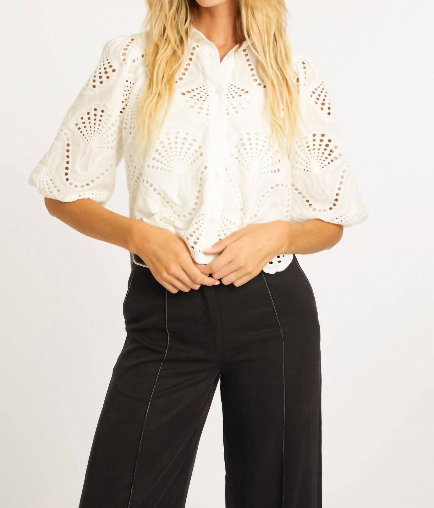 Introducing the Juliette Embroidered Eyelet Top by CABALLERO, an elegant choice in timeless ivory for your vacation wardrobe. This women's short sleeve top features a sophisticated V-neckline and a boho chic appeal. Composition: 100% Cotton. Closure: Button closure. Care: Machine wash and tumble dry. Perfect for spring occasions.